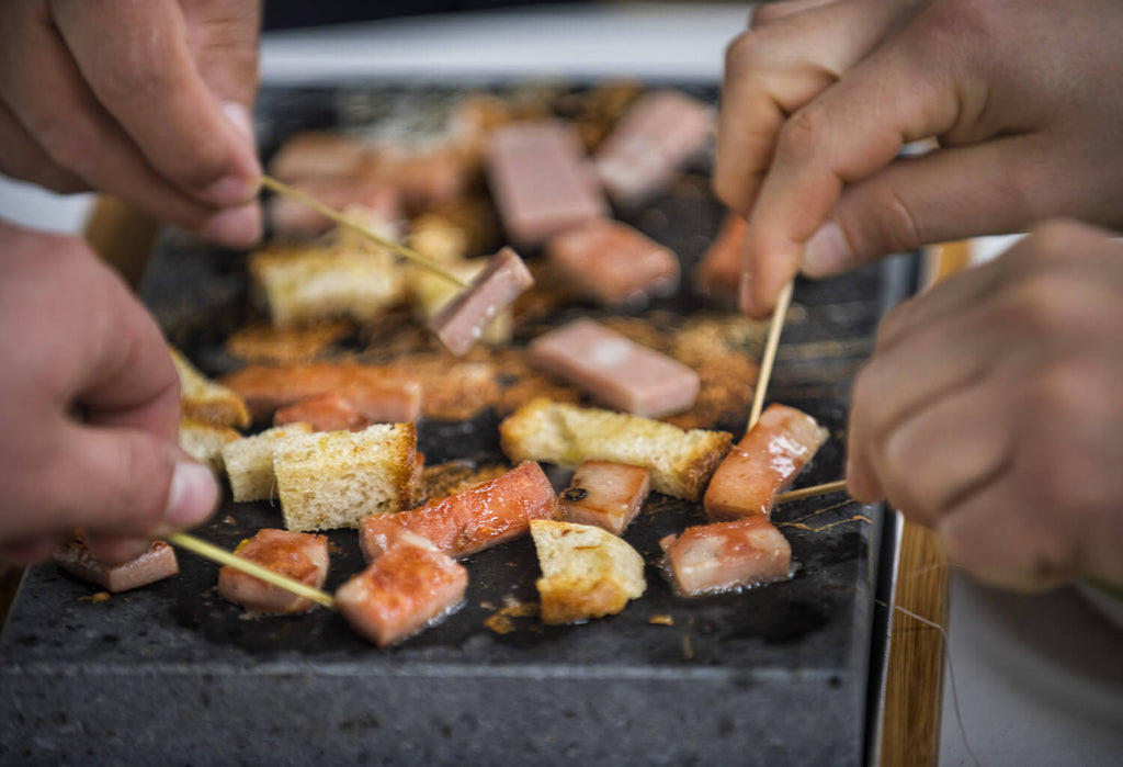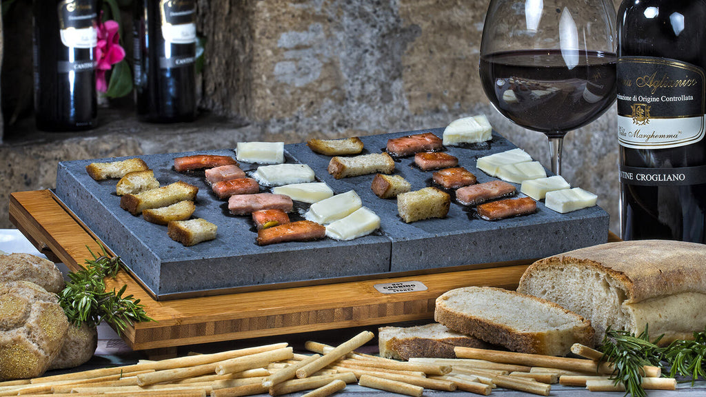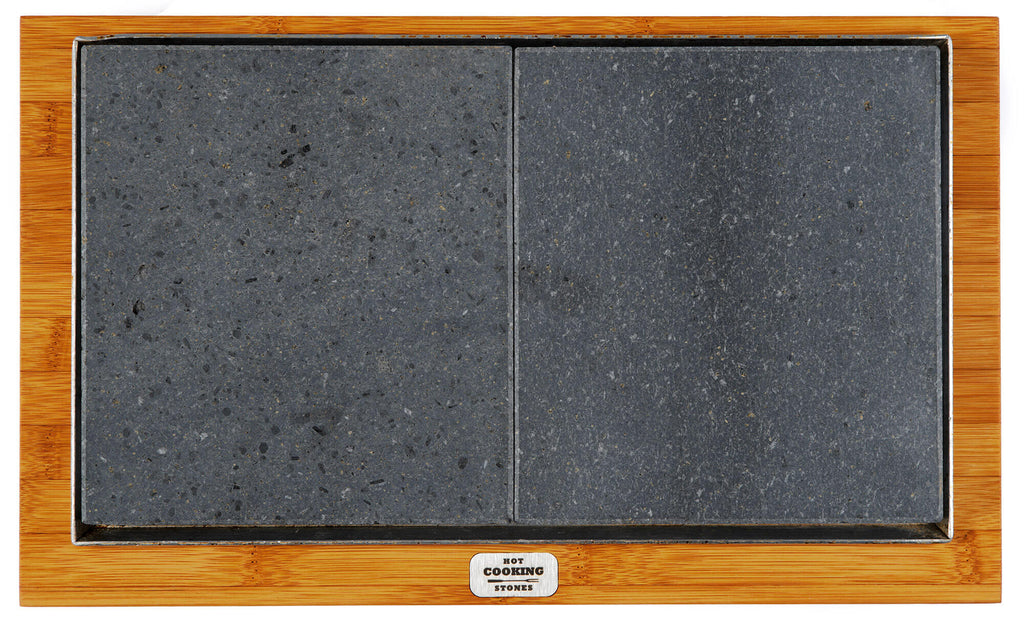 Lavasteinplatte zum Kochen direkt am Tisch geeignet. Ausgestattet mit 1 Aluminiumtablett und einem Bambusholzsockel. Ideal als Mitteltisch für bis zu 4 Personen.
