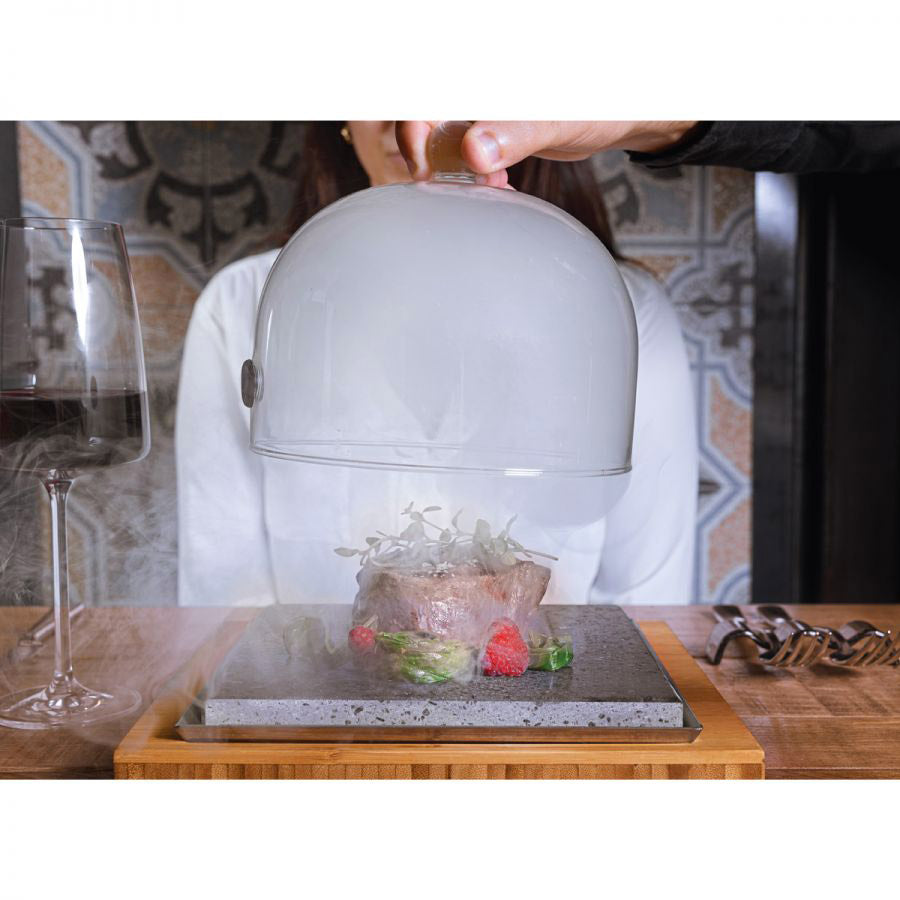 Lavasteinplatte zum Kochen direkt am Tisch geeignet. Ausgestattet mit 1 Aluminiumtablett und einem Bambusholzsockel. Ideal als Mitteltisch für bis zu 2 Personen.