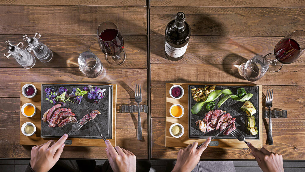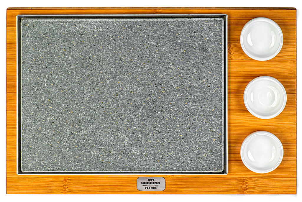 Lavasteinplatte mit Schalen zum Kochen direkt am Tisch geeignet. Ausgestattet mit 1 Aluminiumtablett und einem Bambusholzsockel. Ideal als Mitteltisch für bis zu 2 Personen.