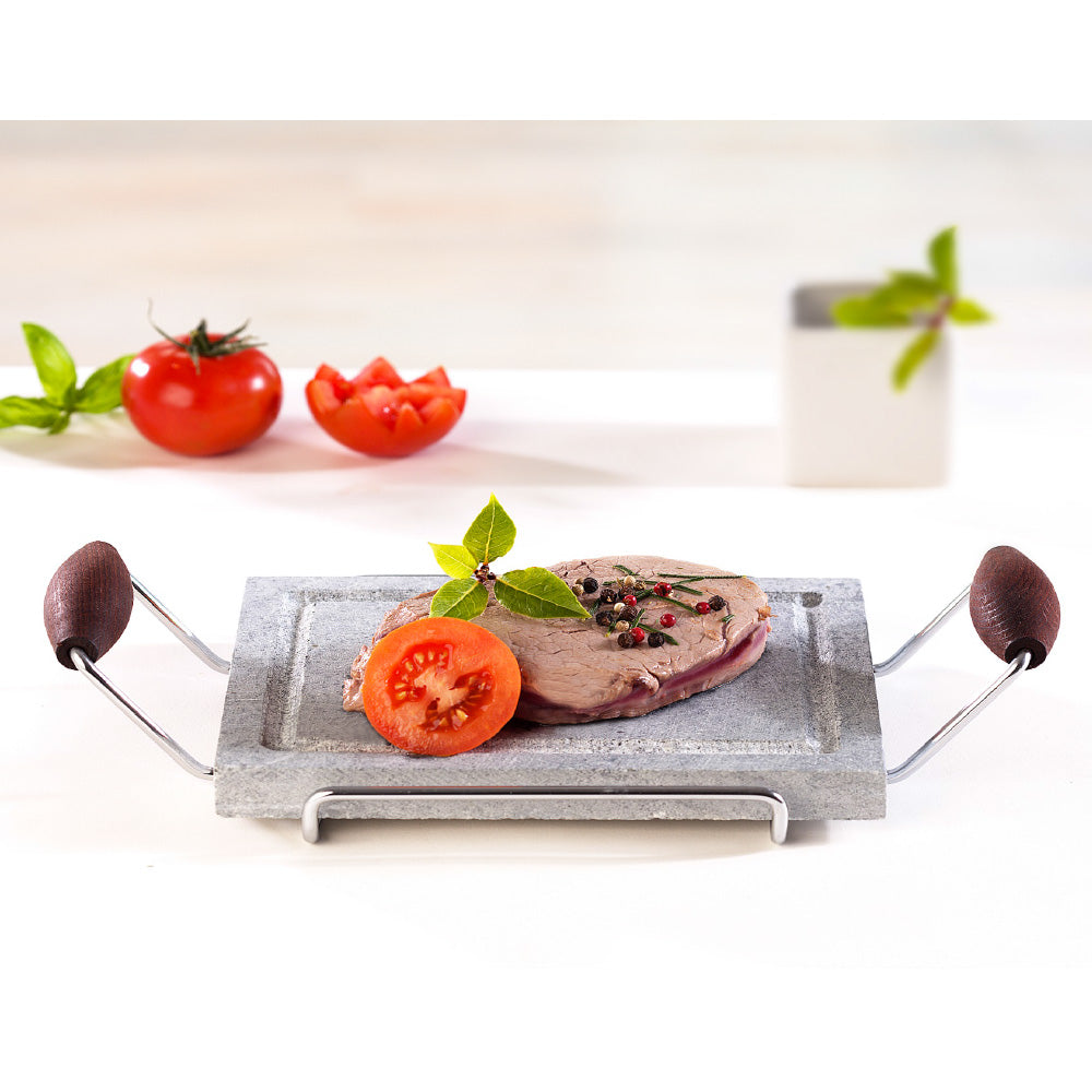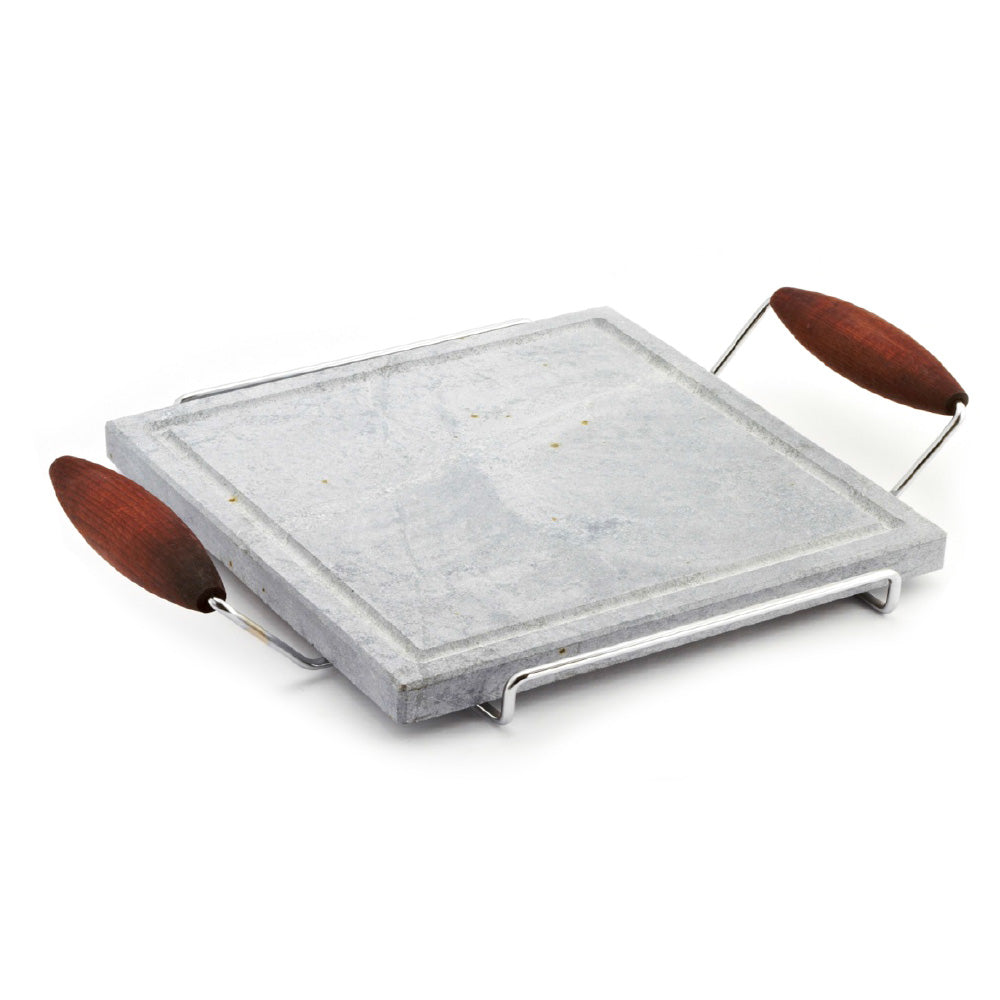 Die Teller aus Speckstein mit Rahmen verbinden die Echtheit des Kochens auf Stein mit der praktischen Metallstruktur mit wengefarbenen Griffen, um Ihre Gerichte mit Stil und Leichtigkeit zu kochen und zu servieren. Sie sind in runden, quadratischen und rechteckigen Formen in verschiedenen Formaten erhältlich, um sich an alle Küchen und alle Gerichte anzupassen.