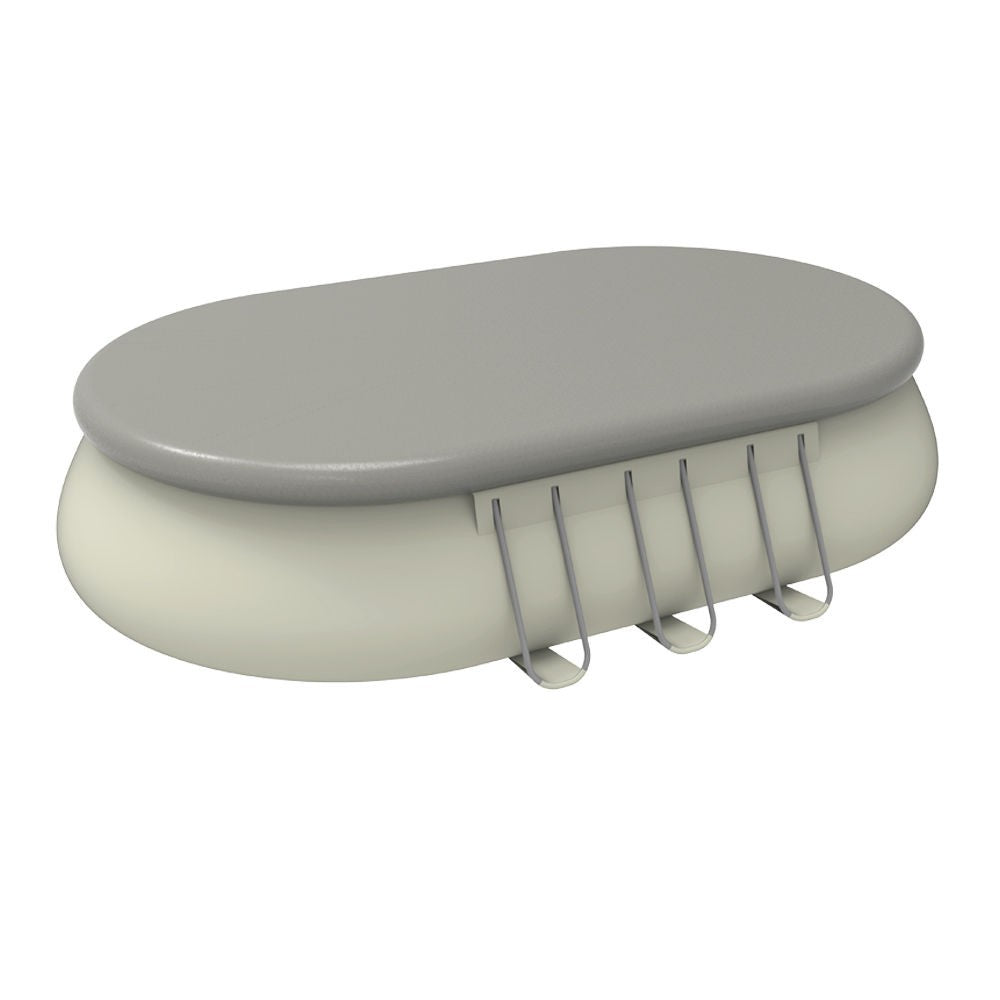 Jilong Ovaler grauer oberirdischer Pool mit aufblasbarem Ring, der von einer rostfreien Stahlkonstruktion und einer mehrschichtigen PVC-Auskleidung getragen wird.