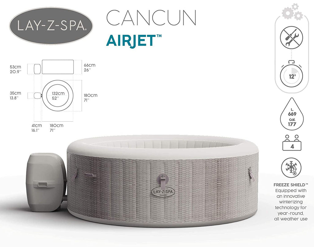 Lay-Z Spa Bestway Cancun Airjet-Jacuzzi-Pool . Ihre Vorstellung von Entspannung wird sich für immer ändern, dank Lay-Z-Spa, dem Outdoor-Whirlpool, den Sie in wenigen Minuten vorbereiten und der keinen Platz einnimmt, wenn Sie ihn nicht benutzen. Perfekt, wenn Sie den Luxus eines echten Spas zu Hause erleben möchten, wenig Platz zur Verfügung haben und Geld sparen möchten. Wir bauen alle unsere Spas einzeln zusammen, lassen sie 24 Stunden lang aufblasen und zerlegen sie schließlich, um sicherzustellen, dass alle Komponenten in einwandfreiem Zustand sind.