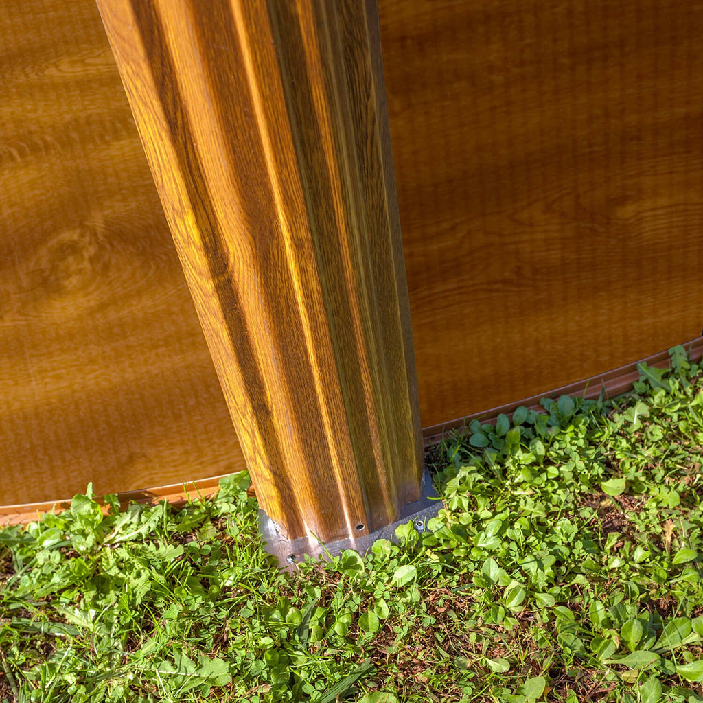 - Piscina ovale con parete in acciaio e decorazione in legno