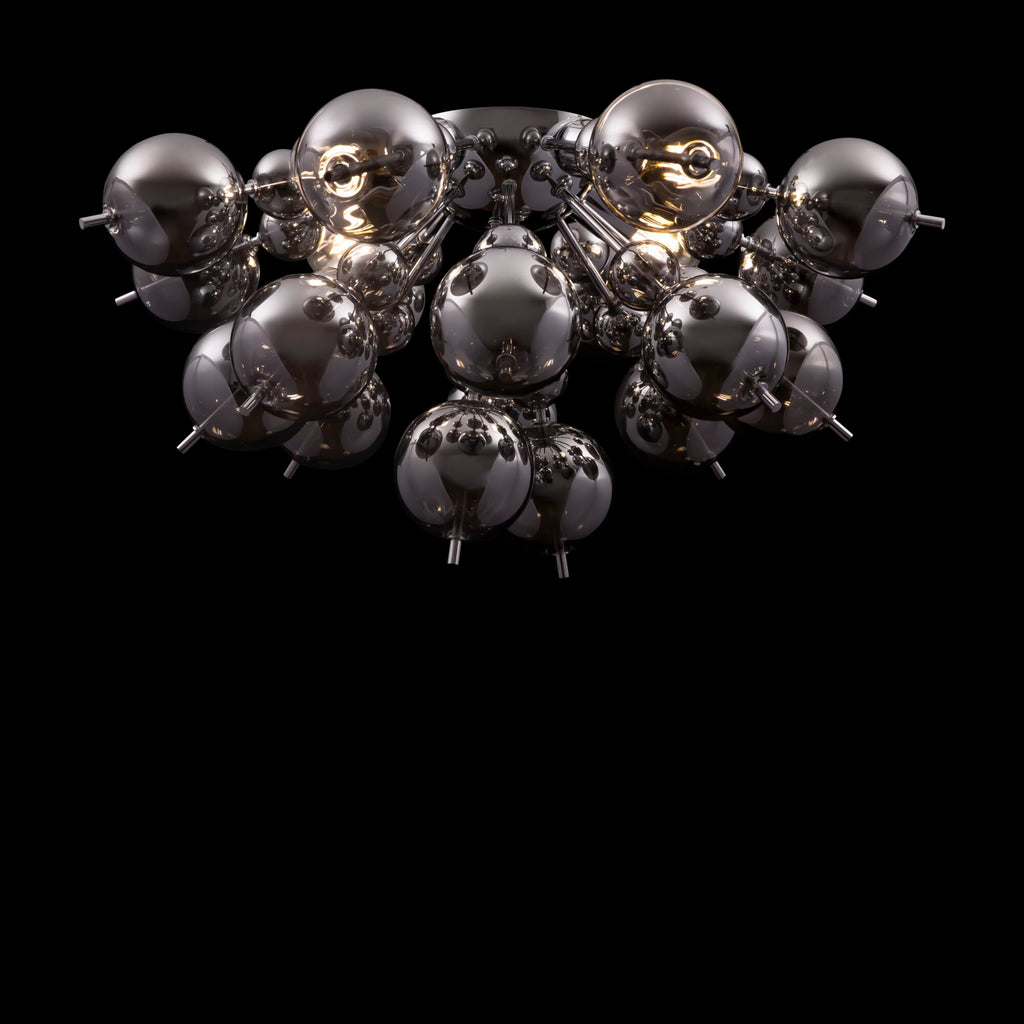 Die Leuchte besteht aus geblasenen Glaselementen mit galvanischer Beschichtung. In zwei Farbkombinationen: Braunglas und messingfarbene Struktur oder Opalglas und chromfarbene Struktur