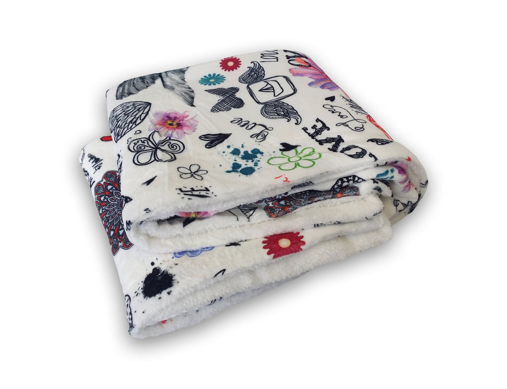 - Stoff: digital bedruckter Flanell oben, hypoallergener Polyester-Sherpa unten