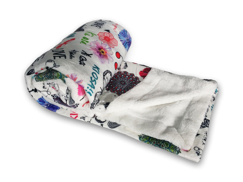 - Stoff: digital bedruckter Flanell oben, hypoallergener Polyester-Sherpa unten