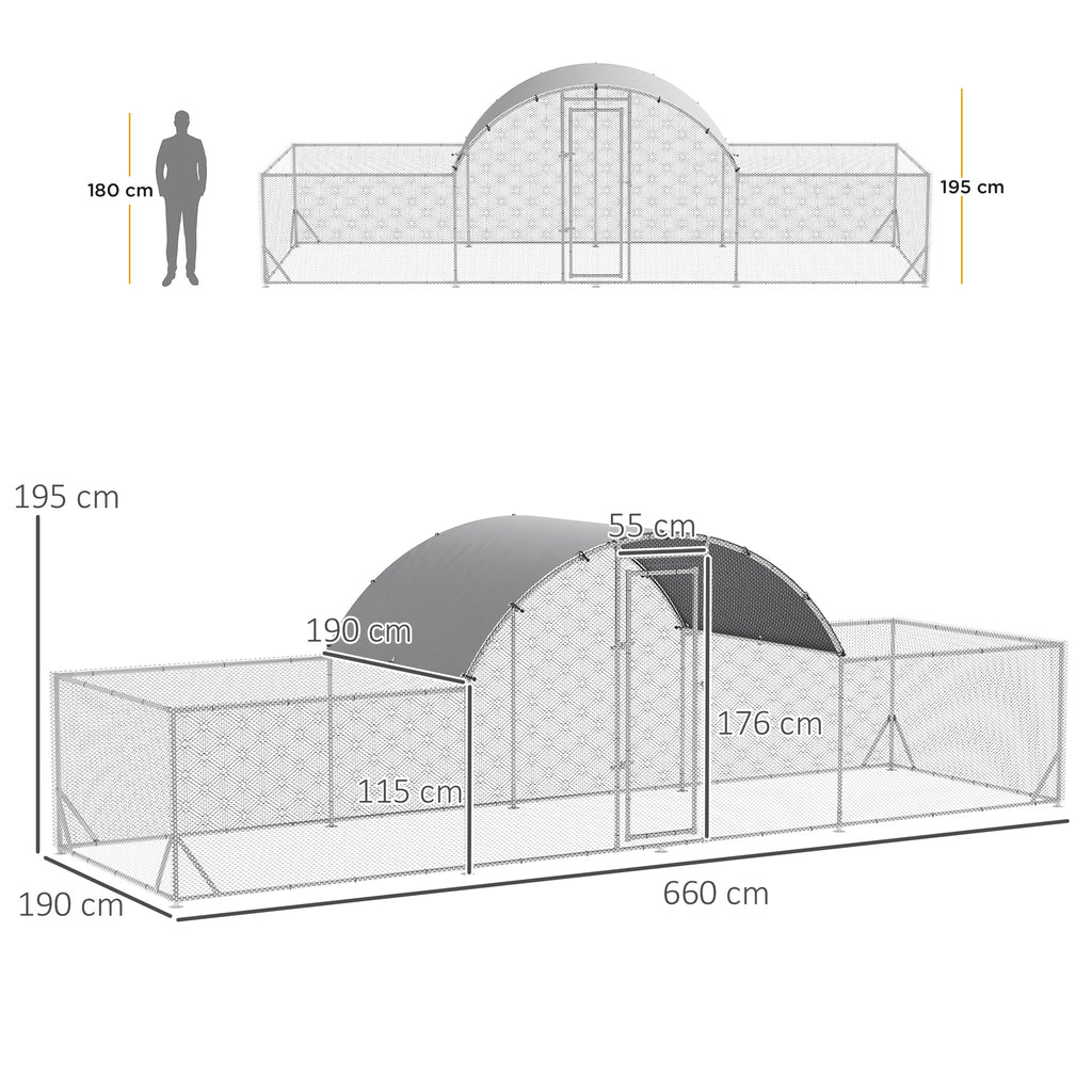 - AMPIO SPAZIO: Grande e spazioso, grazie ai suoi 6,6 m di lunghezza e 12,5㎡, questo pollaio da giardino ha a disposizione un'ampia area per consentire un allevamento di 12-14 galline circa. Accogli i tuoi polli, conigli e anatre in questo luogo sicuro