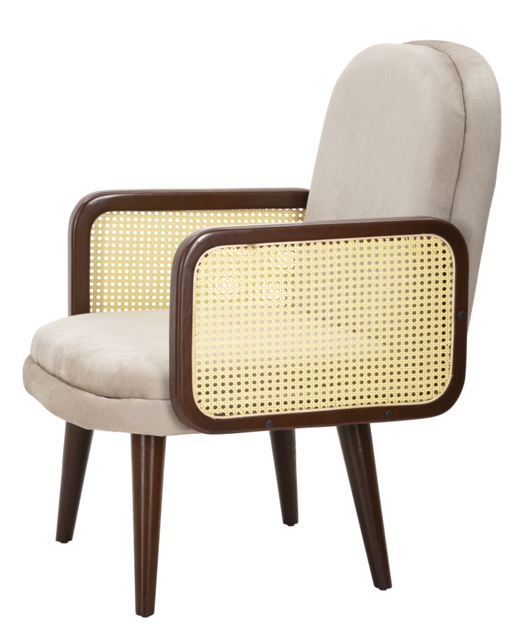 Eleganter Sessel aus gepolstertem Stoff mit besonderen Armlehnen aus Holz und Wienerstroh mit einem von den 70er Jahren inspirierten Design.