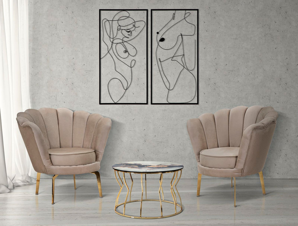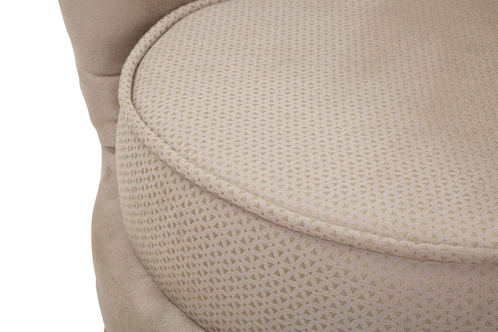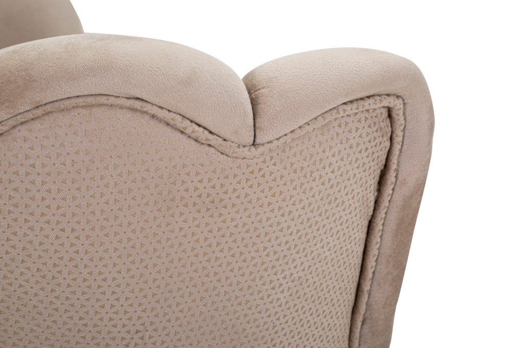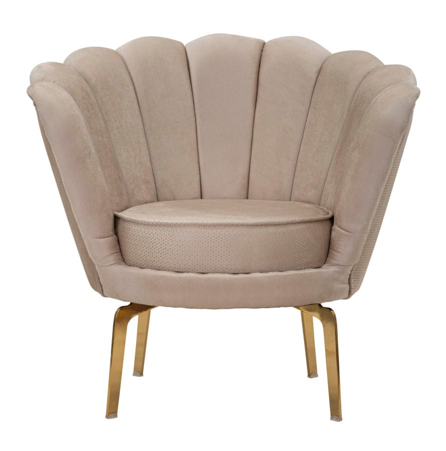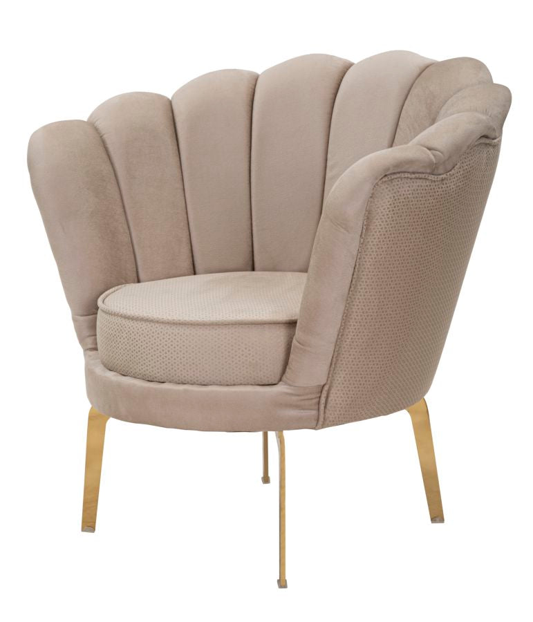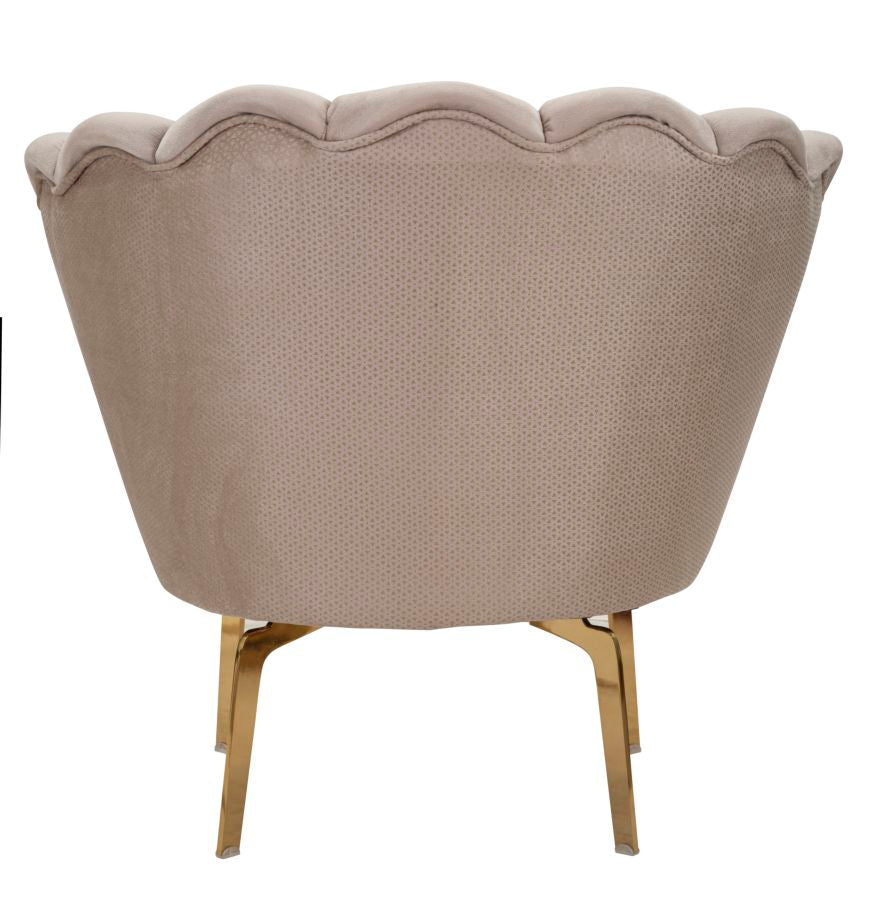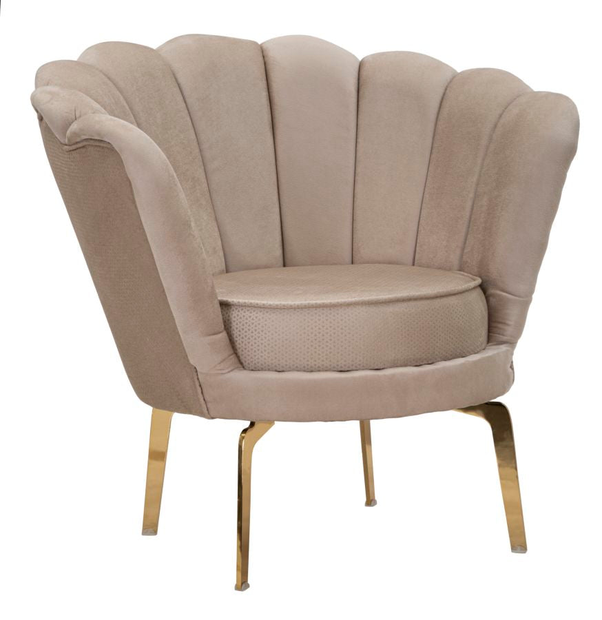 Eleganter Polstersessel aus Stoff. Die besondere Verarbeitung der Rückenlehne erinnert an die Blütenblätter einer Blume und die goldenen Metallbeine verleihen dem Ganzen einen Hauch von Eleganz.