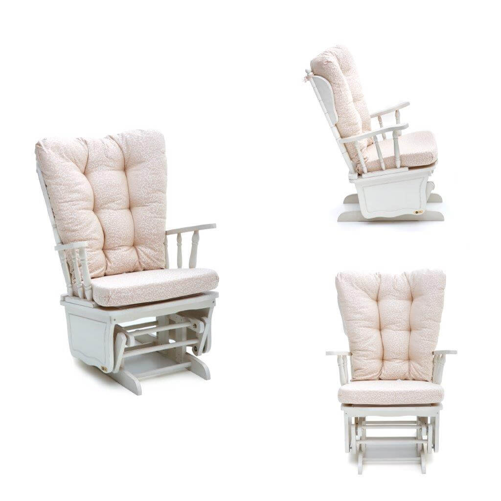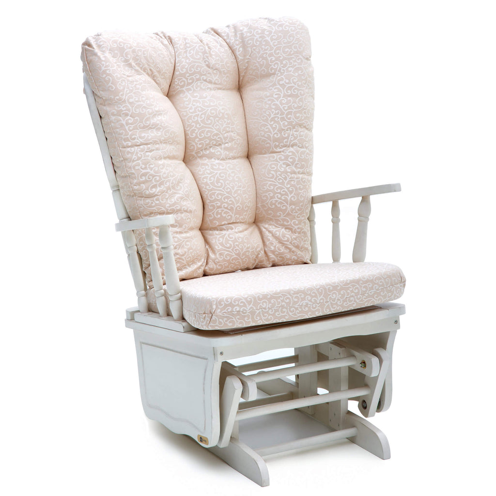Schwingender Schaukelsessel mit weiß gebeizter Massivholzstruktur, gestepptes Kissen mit beigefarbener Polyesterpolsterung.