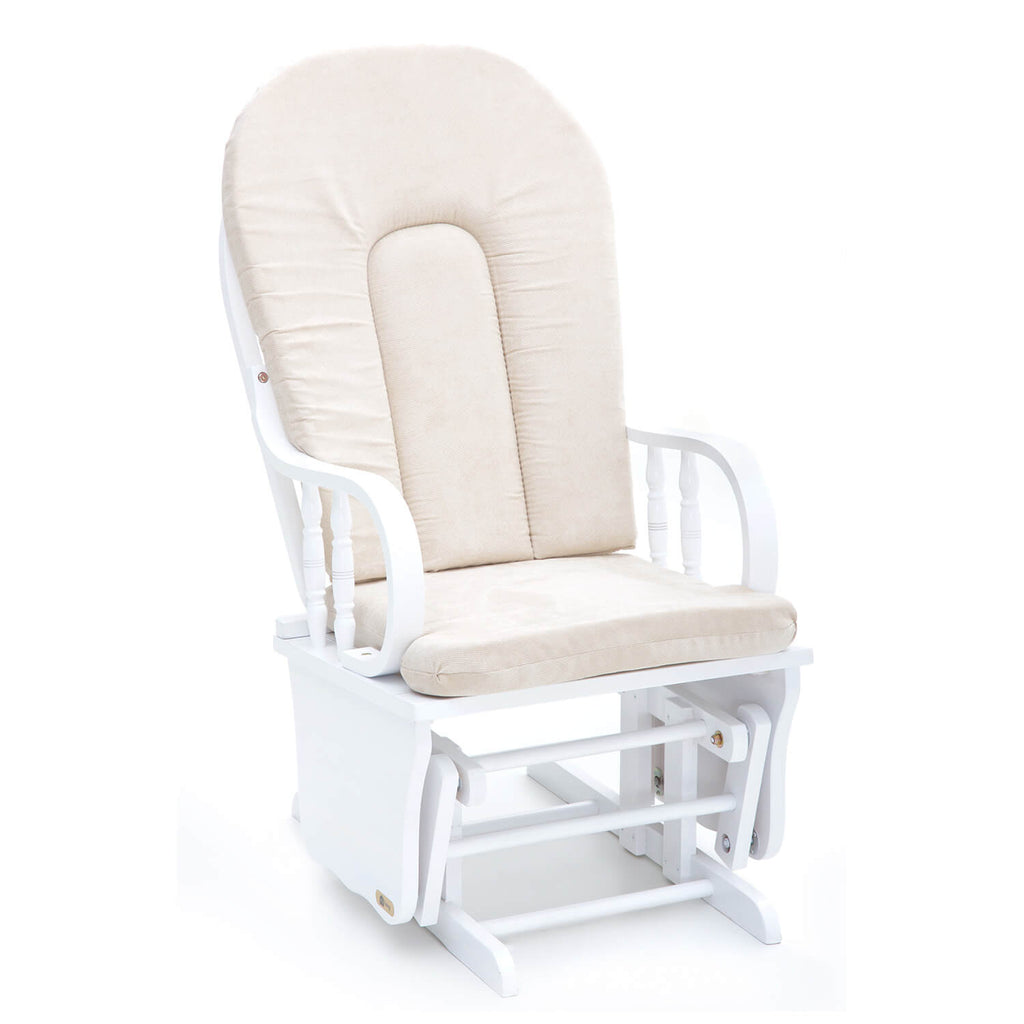 Schwingender Schaukelsessel mit Struktur aus weiß lackiertem Massivholz, gepolstertes Plattenkissen aus beigem Polyester.