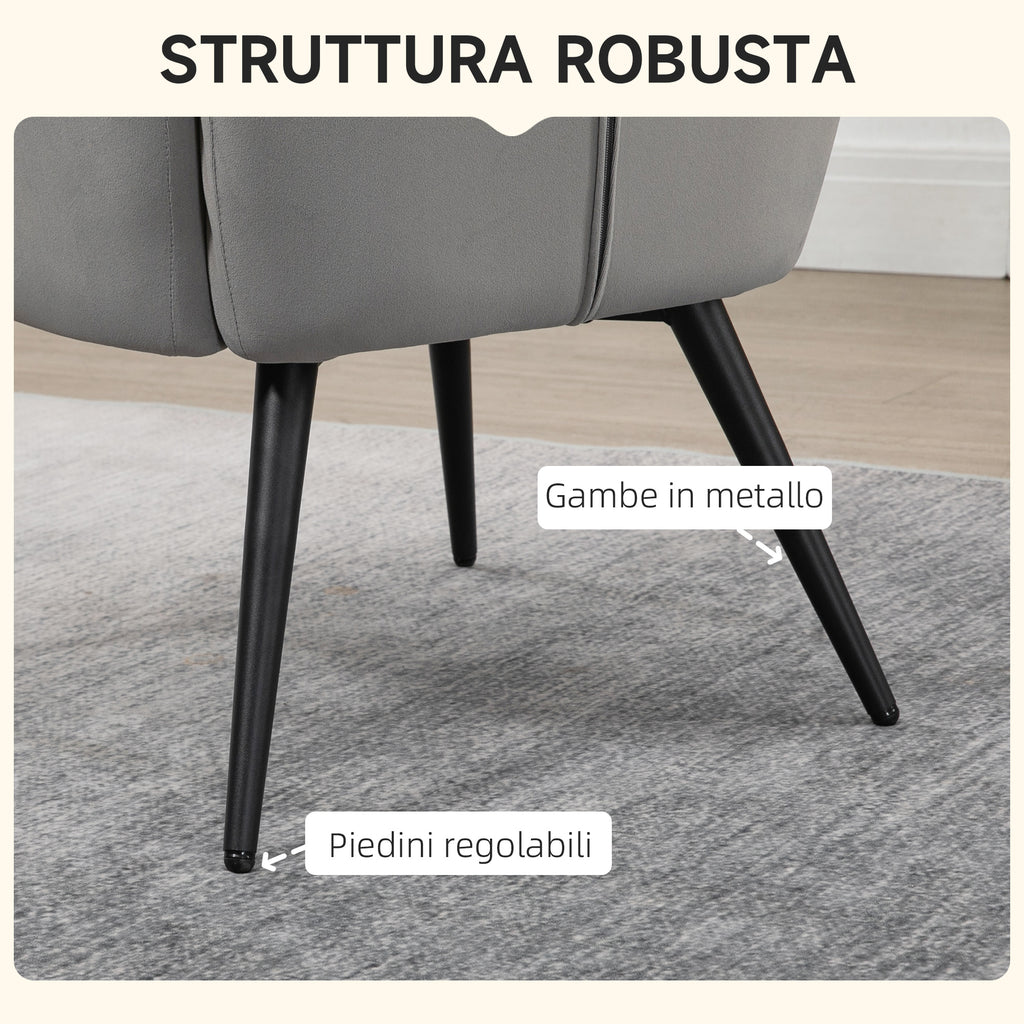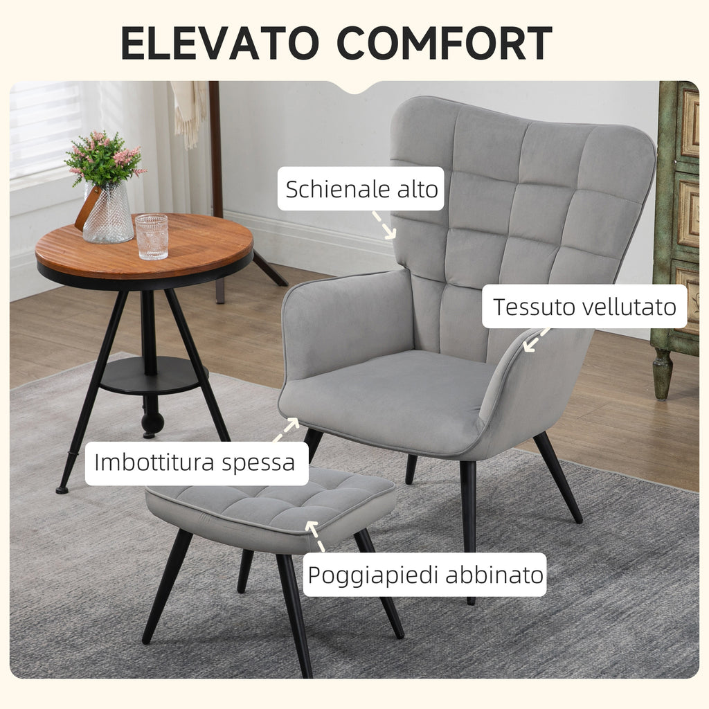 Poltrona D'Arredo Imbottita con Braccioli e Poggiapiedi Integrato in Tessuto Effetto Velluto Grigio Chiaro