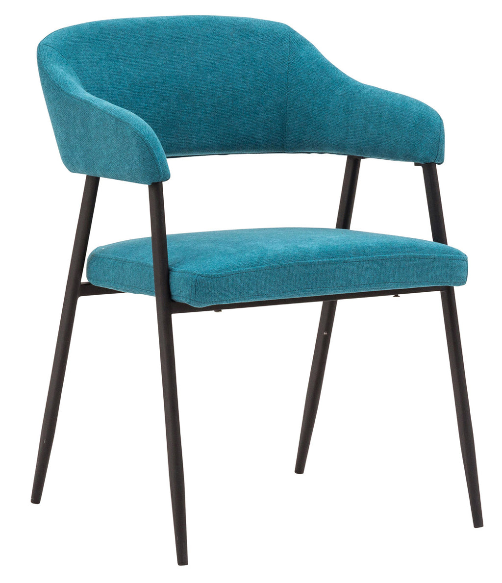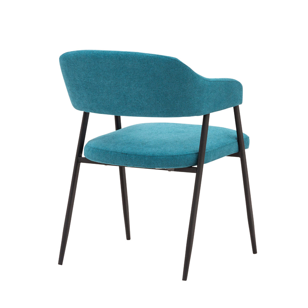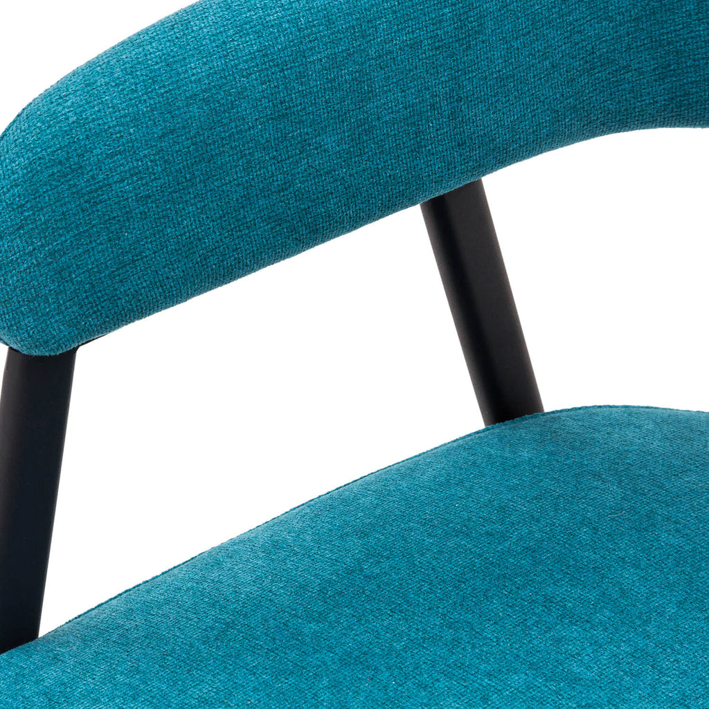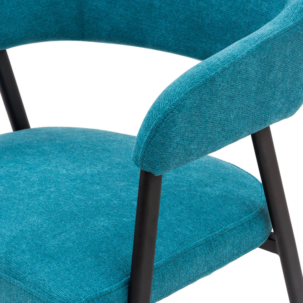 Sessel ITACA mit schwarzer Metallstruktur, Sitz mit Polyurethanpolsterung und Bezug in petrolgrünem Stoff.