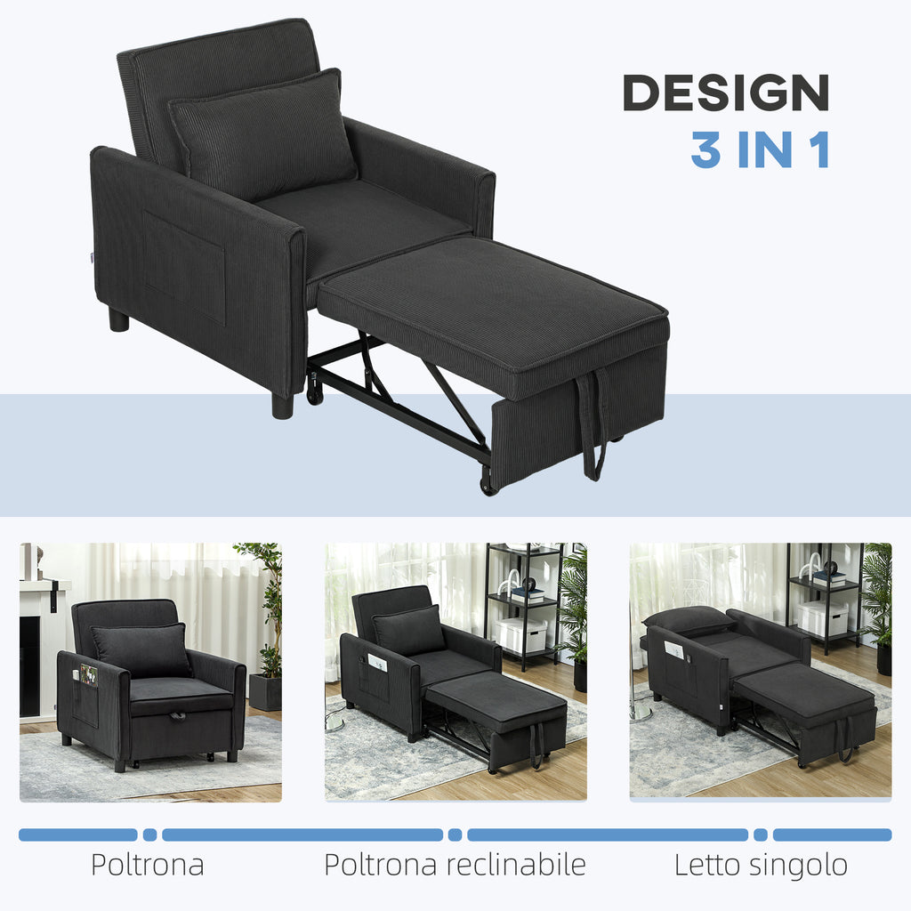 Struttura convertibile facilmente da chaise longue a poltrona reclinabile o letto singolo. Il meccanismo clic clac della poltrona letto permette di regolare lo schienale in tre posizioni, con un angolo massimo di 180°. Il rivestimento in velluto a coste della poltrona letto singolo offre una sensazione di morbidezza per il comfort della pelle. Seduta imbottita con molle ed elastici. Cuscino extra con copertura removibile e lavabile incluso per una manutenzione facile. Poltrona moderna con tasche laterali per una conservazione pratica. Struttura solida per garantire la giusta stabilità e durata. Montaggio richiesto.