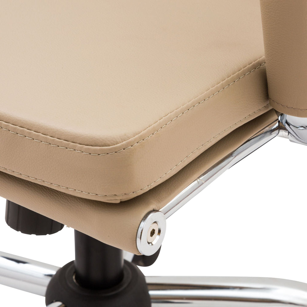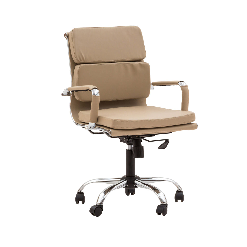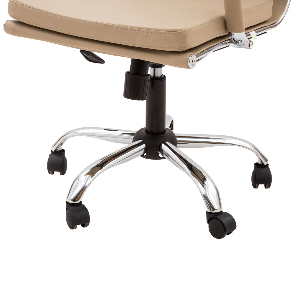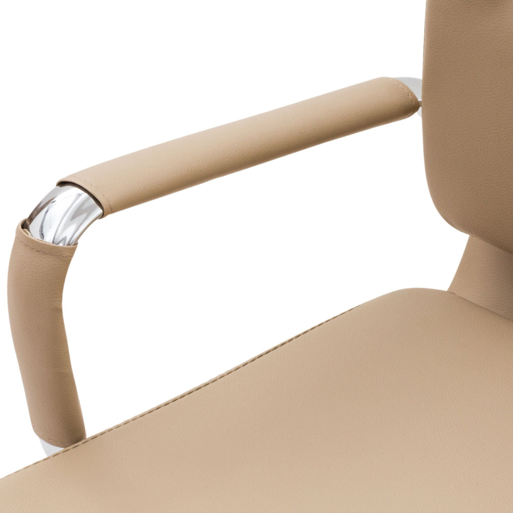 Poltrona da ufficio girevole con elevazione a gas. Struttura in metallo cromato con base a cinque razze, dotata di ruote in ABS. La seduta è con imbottitura in poliuretano rivestito con similpelle tortora. Lo schienale è in tre moduli imbottiti in poliuretano e rivestiti in similpelle tortora. Copribraccioli in similpelle tortora.