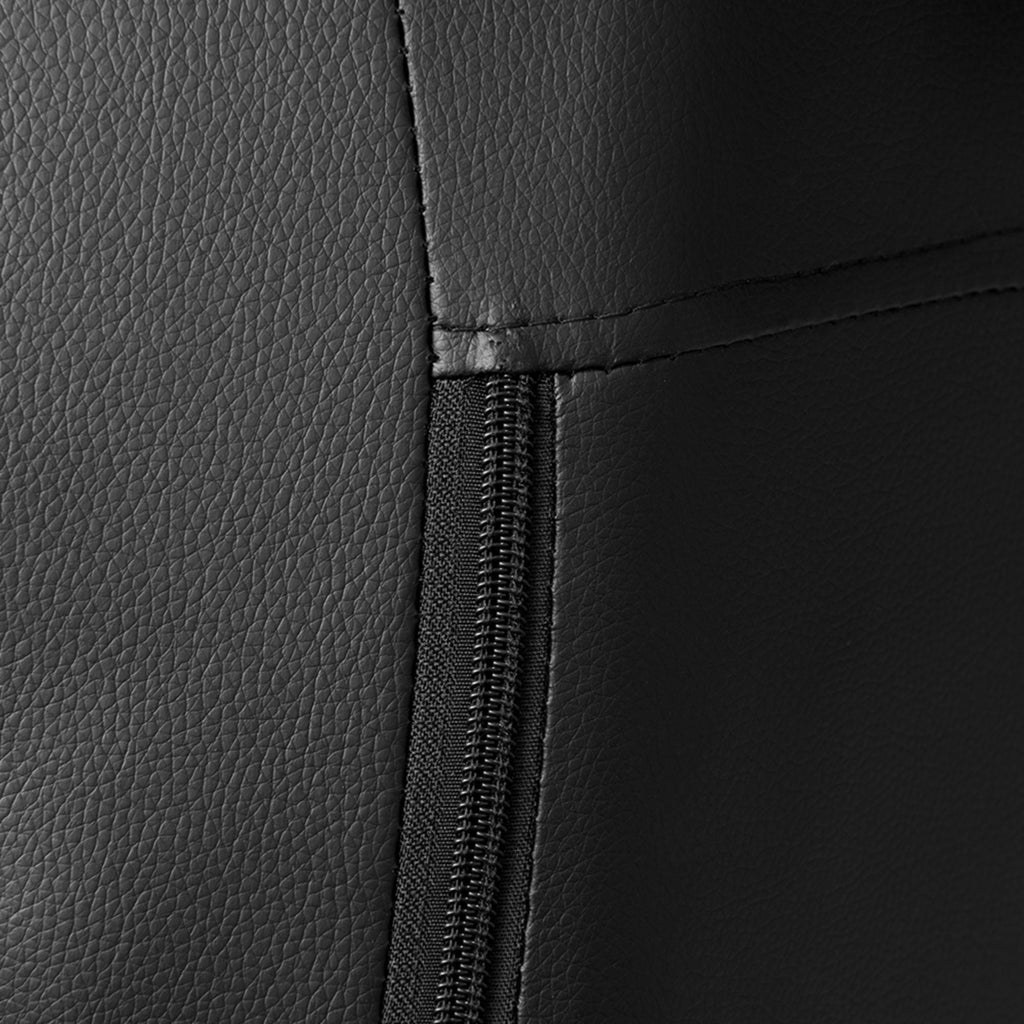 Poltrona girevole con sistema di elevazione a gas. Struttura con base con rotelle a cinque razze. Seduta e schienale imbottiti e rivestiti in ecopelle nera con dettagli in tessuto traspirante. Poggiapiedi estraibile e imbottito