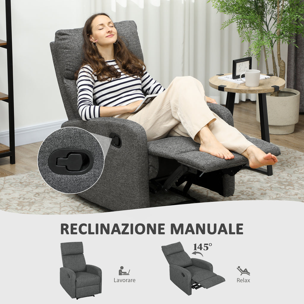 • STRUTTURA RECLINABILE: Reclina questa poltrona da soggiorno fino a 145° mediante controllo manuale e goditi un riposo meritato Per alzarti, è sufficiente premere con le gambe o i talloni per ritirare il poggiapiedi con fluidità