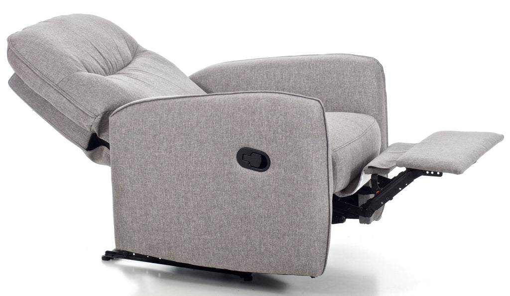 Die Fußstütze wird über den seitlichen mechanischen Hebel verstellt, während das manuelle Liegesystem durch leichten Körperdruck auf Rückenlehne und Armlehnen aktiviert wird.