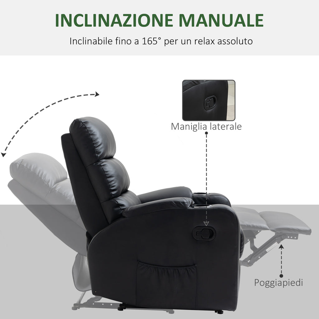 Poltrona Relax Reclinabile Manualmente a 165° con Poggiapiedi Portabicchieri e Tasca in Finta Pelle Nero
