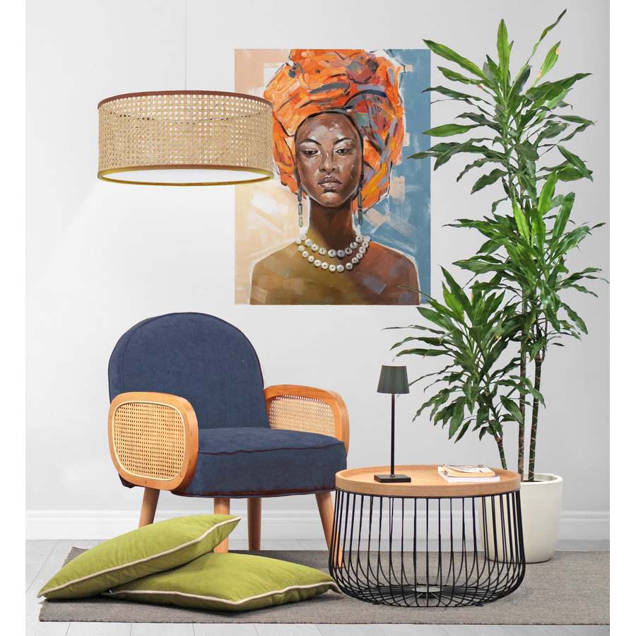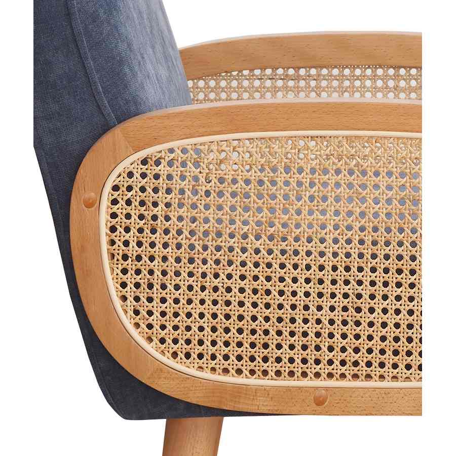 Poltrona design vintage Doris la poltroncina ideale per qualsiasi ambiente. Che si tratti del soggiorno, dello studio o della tua camera da letto questo modello dona un autentico tocco di originalità e confort. L'unicità è dovuta alla rivisitazione del classico stile mid century a cui si aggiungono influenze scandinave e moderne. Doris presenta una struttura in legno di faggio e un elegante rivestimento in tessuto blu impreziosito da braccioli in legno di rattan e paglia di vienna.