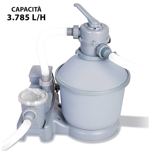 Effektive Sandfilterpumpe, einfach zu bedienen, äußerst komfortabel und kostengünstig, da sie im Gegensatz zu herkömmlichen Pumpen keine Nachfüllkartuschen benötigt, sondern nur Sand nachgefüllt werden muss, wenn dieser verschmutzt ist! Seine Bedienung ist sehr einfach und simuliert in gewisser Weise das, was in der Natur passiert: Das Wasser wird in den Tank mit Quarzsand gepumpt und hält wie in der Natur Verunreinigungen und Partikel zurück, um sauberes Wasser in den Pool zurückzuführen. Aus korrosionsbeständigem Material mit 18-kg-Tank für Quarzsand n. 20 von 0,45 bis 0,55 mm. Für Becken und Anschlüsse von Ø 32 und 38 mm. SAND NICHT ENTHALTEN. Kapazität 3785 Liter pro Stunde. Inklusive Schläuche und Fittings für den Anschluss.
