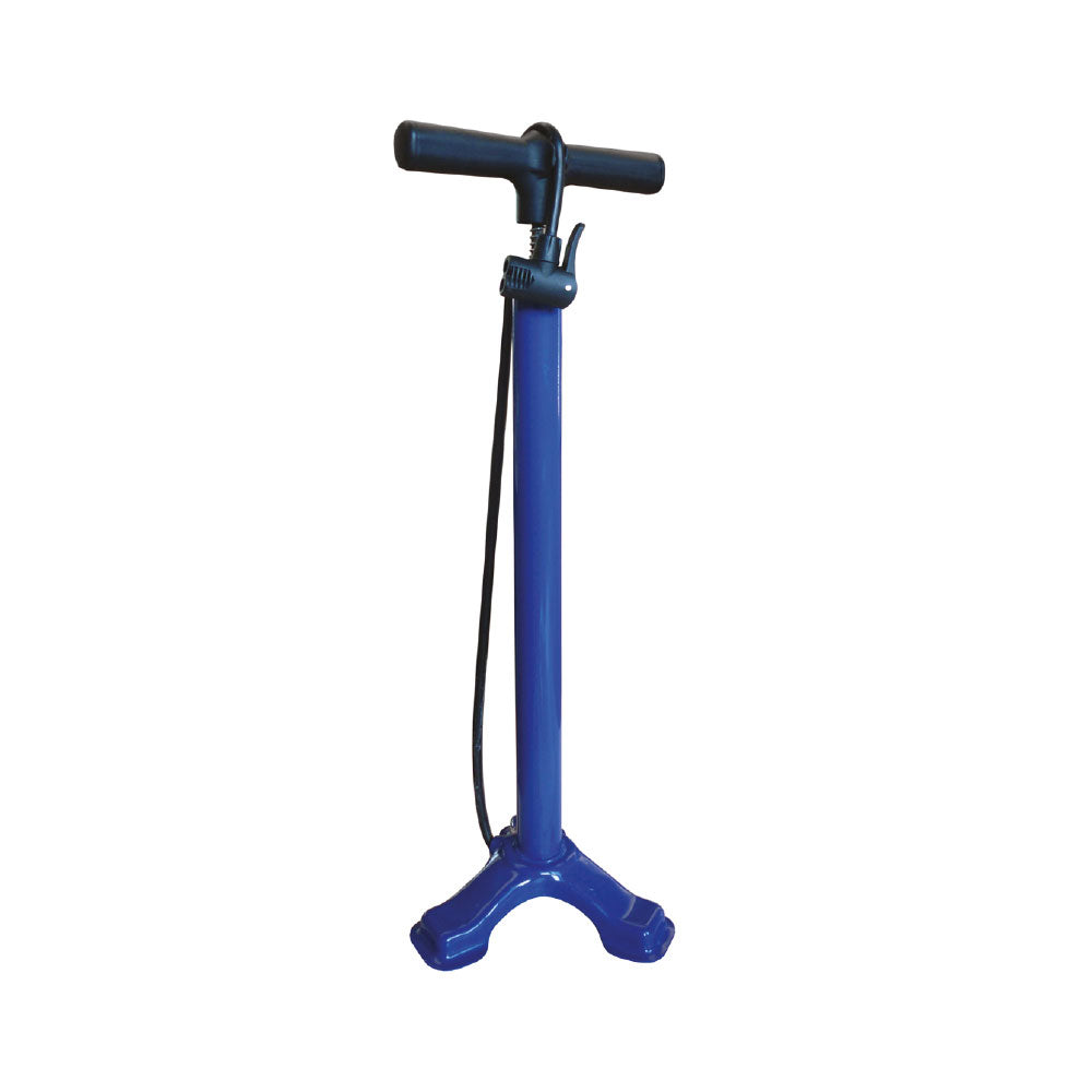 Pompa officina in acciaio. Manico ergonomico. Base a 3 piedi. Raccordo doppia valvola Presta/Schrader.