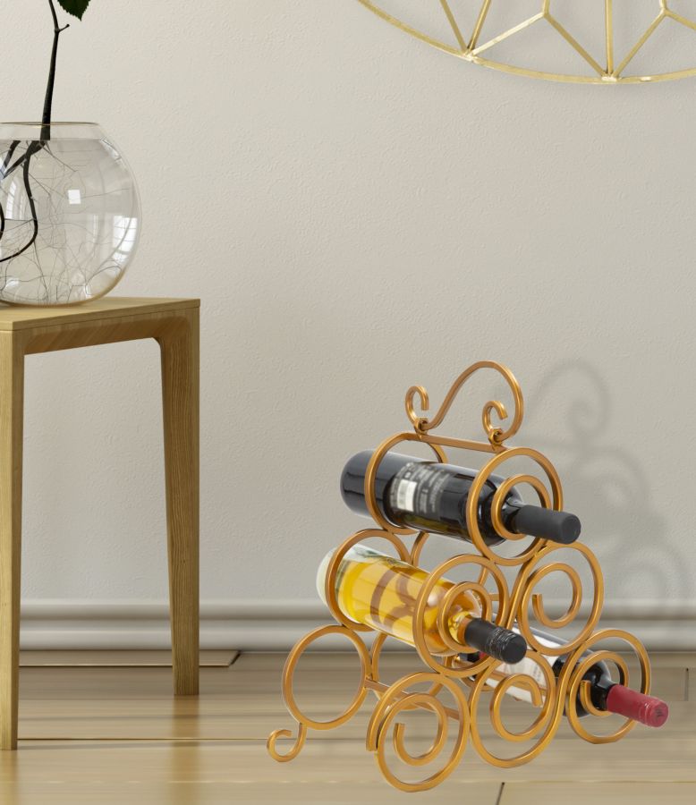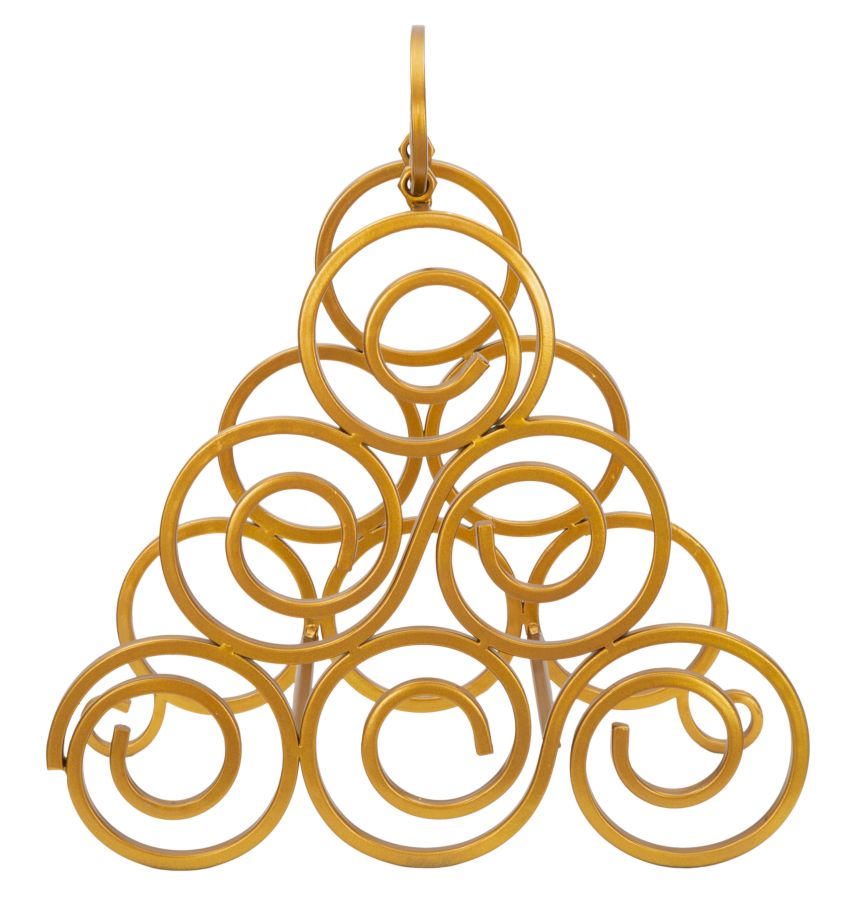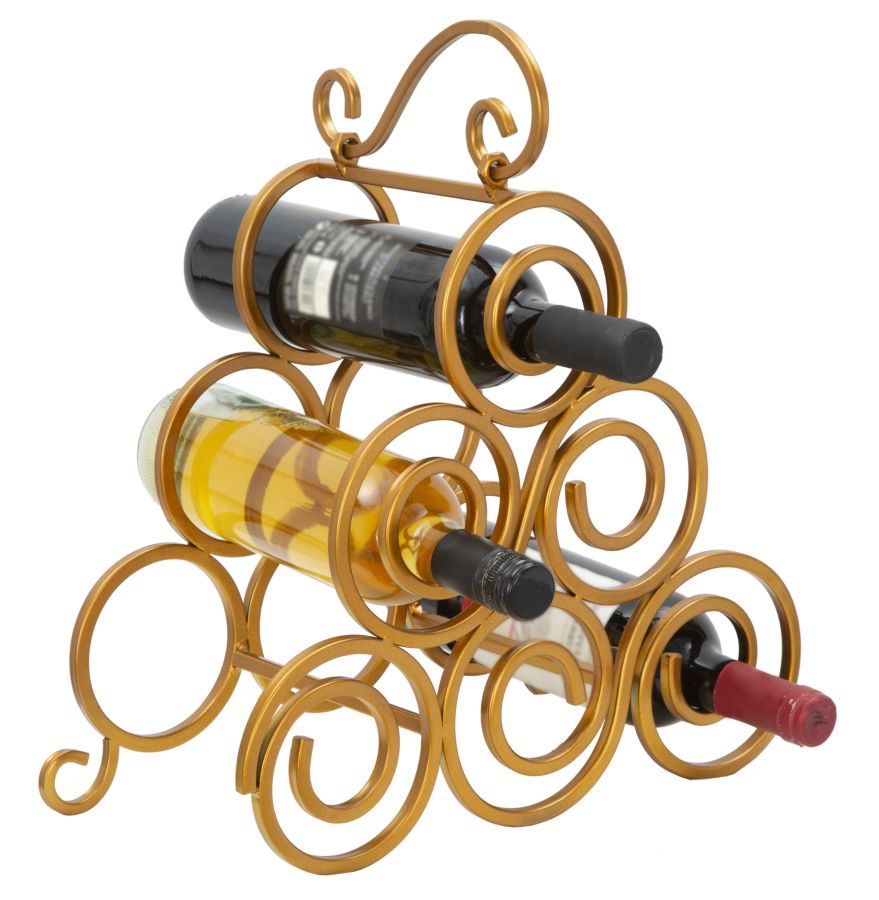 Eleganter Tischflaschenhalter aus goldfarbenem Metall. Für Liebhaber guten Weins ein glamouröser Flaschenhalter, der Ihrer Genussecke Klasse und Raffinesse verleiht. Es kann 6 Flaschen aufnehmen.