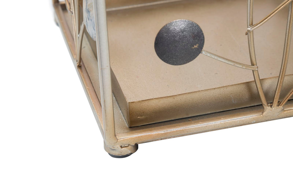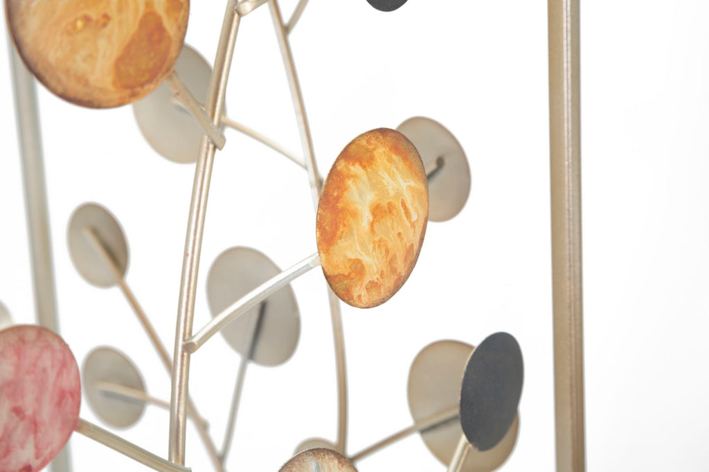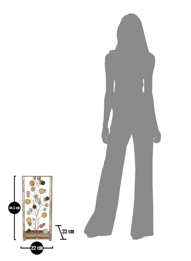Eleganter quadratischer Schirmständer aus goldenem Metall mit dekorativen Kreisen in verschiedenen Farben, die an die Zweige von Bäumen mit Blättern und Früchten erinnern. Ein süßer Hauch von Eleganz für jeden Eingang.