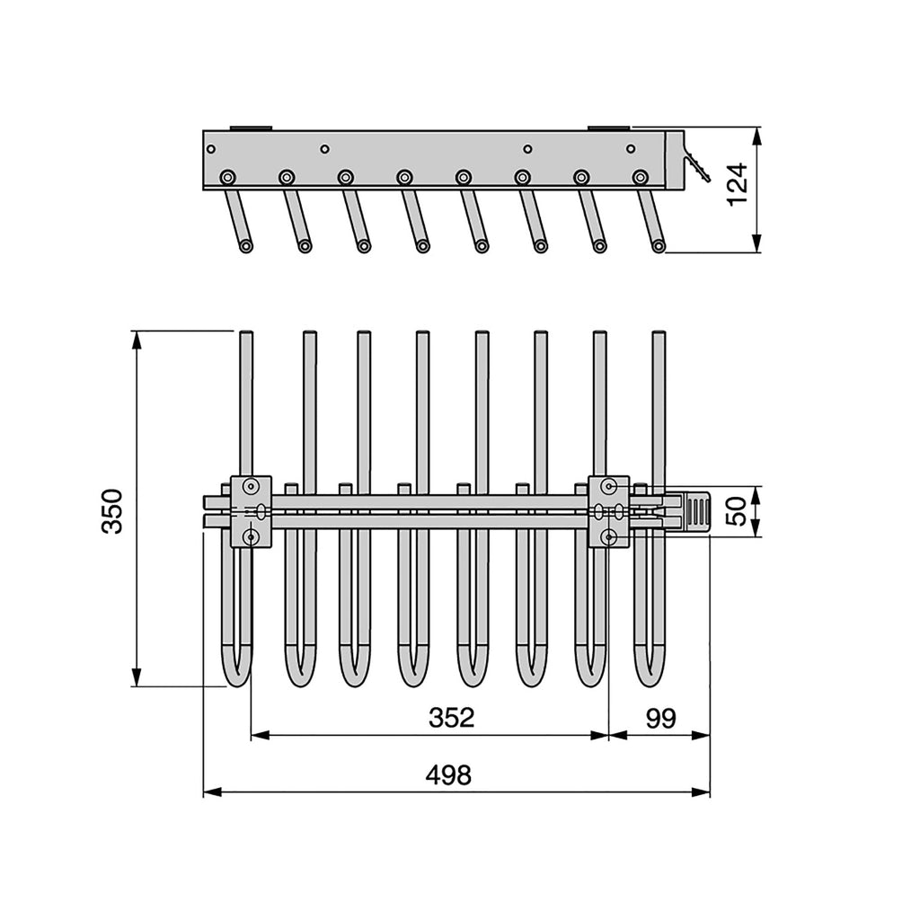 Mit dem selbstausziehbaren Hosenbügel können Sie den Platz in den Kleiderschränken effizient organisieren und den Zugriff auf die Kleidung erleichtern. Er besteht aus aluminiumfarben lackiertem Stahl und grauem Kunststoff und verfügt über 450-mm-Vollauszüge. Mit Griff an der Vorderseite, um das Herausziehen des Mechanismus zu erleichtern.