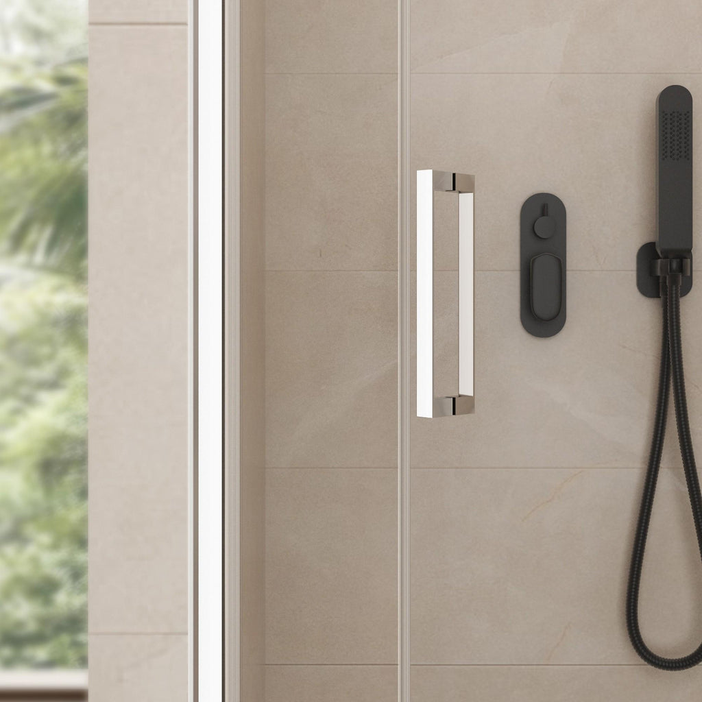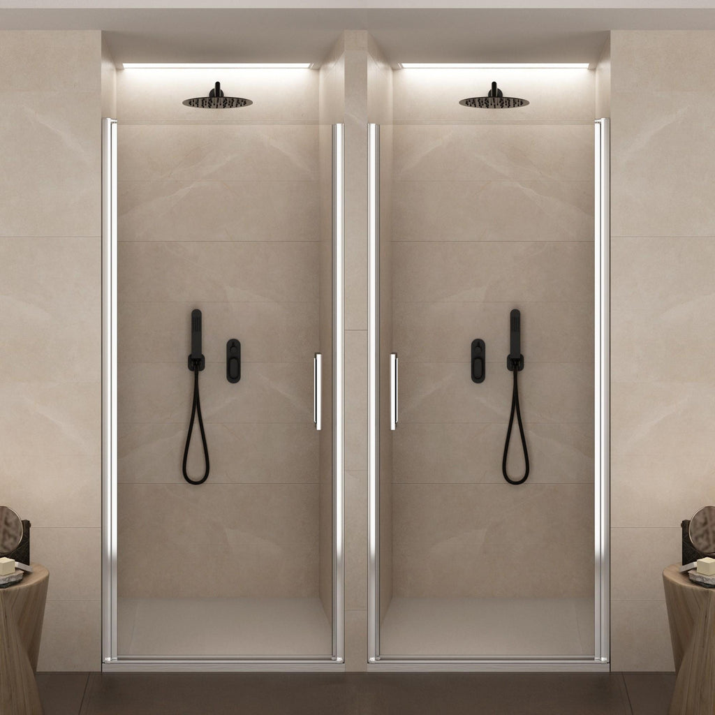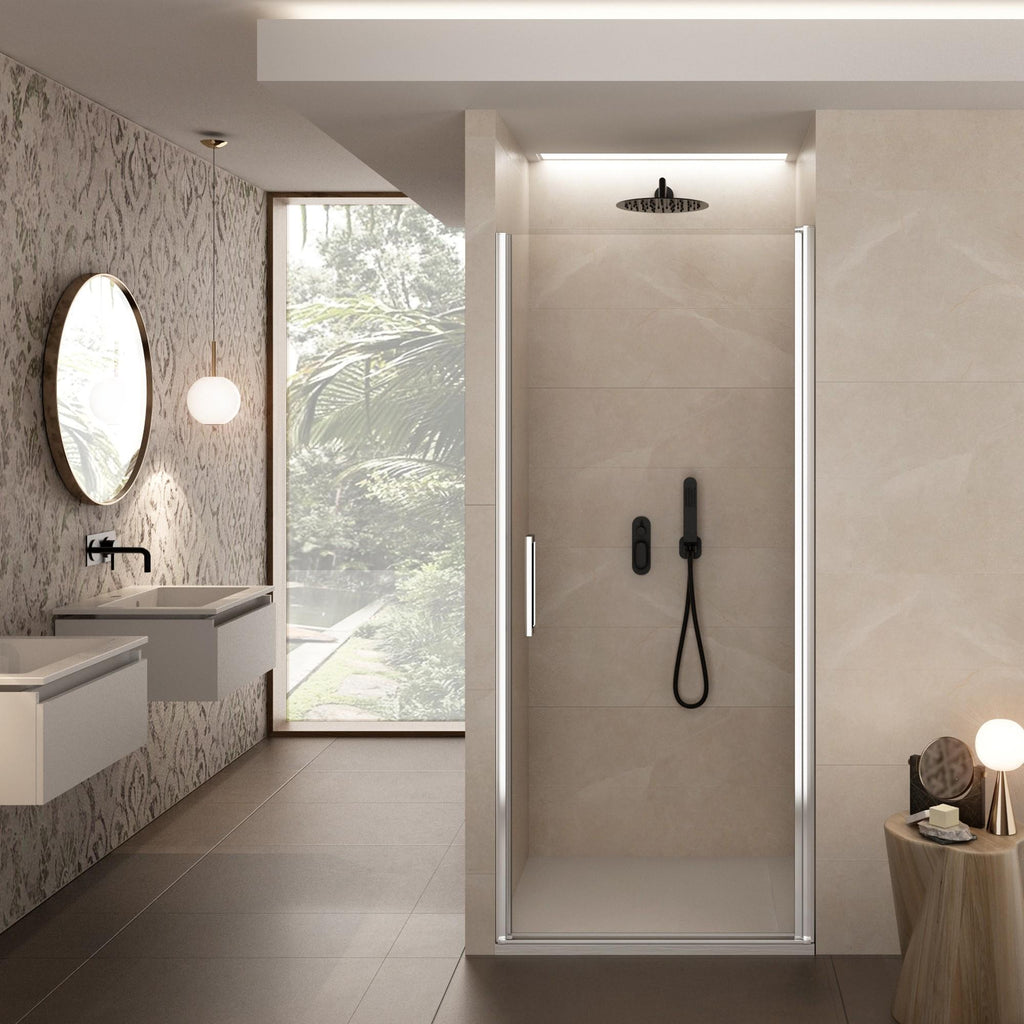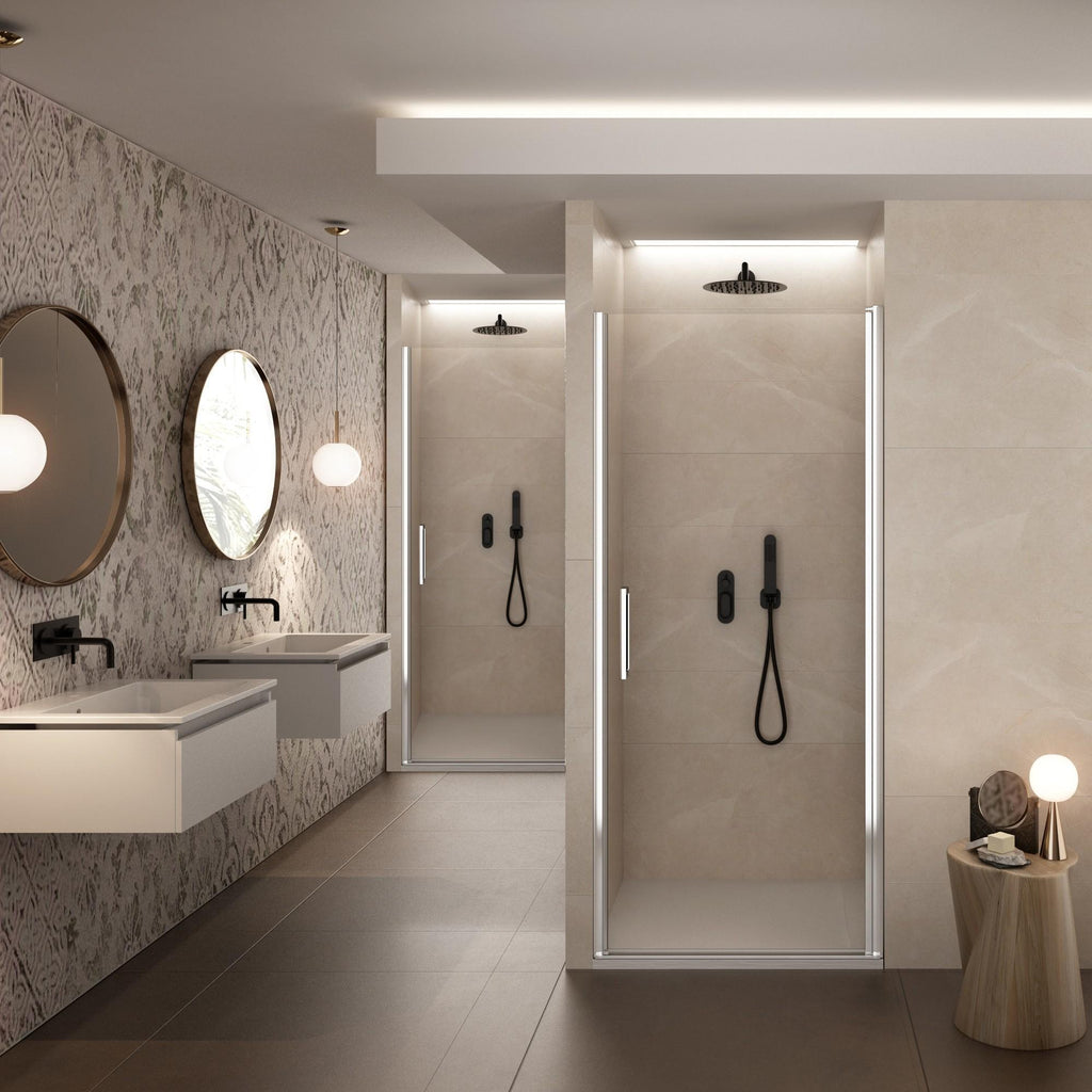 Ein Designerbad braucht ein Produkt, das dieser Aufgabe gewachsen ist. Die aufklappbare Nischen-Duschtür besteht aus gehärtetem 6-mm-Glas mit Antikalkbehandlung , die eine Reinigung ohne Verwendung von Produkten ermöglicht. Die Anti-Kalk-Behandlung wird während der Herstellung des Glases aufgetragen und schafft so einen perfekten Schutz gegen äußere Einflüsse wie Seifen, Shampoos, Kalk. Mit der Duschabtrennung von Salema können Sie im Laufe der Zeit Geld sparen und die Produktion von nutzlosem Kunststoff vermeiden.