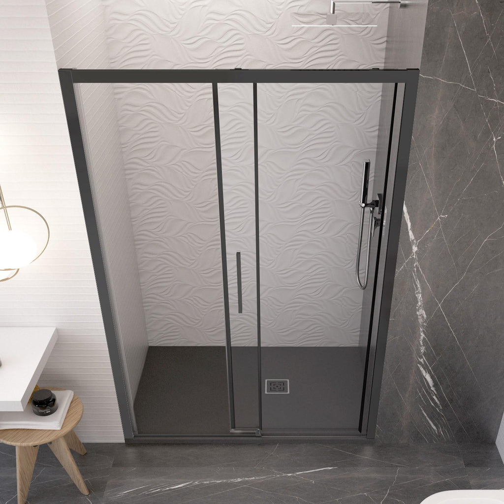 Diese Duschtür verfügt über die Eigenschaften einer Duschabtrennung der Spitzenklasse und positioniert sich im Luxusproduktsegment. Ausgestattet mit Komponenten, die für eine lange Lebensdauer ausgelegt sind. Mattschwarz eloxiertes Aluminium. Griffe aus schwarzem Edelstahl Aisi 304. Anti-Kalk-Behandlung im Nano K1-Ofen. ISO-zertifizierte gehärtete Kristalle gemäß CE-Normen.