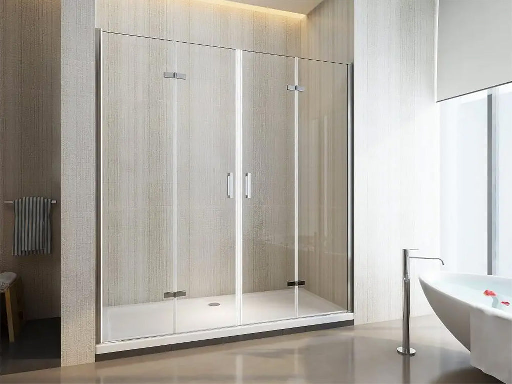 Duschfalttür mit Gesamtöffnung mit 4 Türen, Faltöffnung nach innen. Die Türen schließen wie ein Paket und der Eingang wird vollständig, eine Lösung, die entwickelt wurde, um dank des Paketverschlusses einen breiten Zugang in die Dusche zu gewährleisten, halb nach rechts und halb nach links, die Türen klappen nach innen. Minimale Größe - maximales Ergebnis. Unsere Falttüren sind aus 6 mm dickem Antikalk-Hartglas gefertigt, der Rahmen ist verchromt und hat eine Höhe von 190 cm.Sehr oft besteht beim Entfernen der Schüssel die Notwendigkeit, einen großen Eingang und in diesen zu gewährleisten Fällen suchen wir eine Duschlösung, die ästhetisch nicht aufdringlich ist, aber funktional und praktisch zugleich. Dieses Modell der faltbaren Duschtür ist einfach zu installieren und sauber zu halten, da es keine besonderen Mechanismen, alle 6 mm Antikalkglas und verchromte Aluminiumverkleidungen hat. Die Dichtheit und Stabilität werden durch die robusten und starken Wandscharniere gewährleistet, das Öffnungs- und Schließsystem der Falttüren wird durch Scharniere aus verchromtem Messing gewährleistet, die lange halten und keiner Beeinträchtigung durch Wasser unterliegen. Die Anpassung wird durch die teleskopischen Wandprofile garantiert, die Installation ist sehr einfach, das System ist einfach und intuitiv und erfordert keine besonderen Fähigkeiten, die mit dem Produkt gelieferte Installationsanleitung ist sehr nützlich. Die vertikale Wasserdichtigkeit erfolgt durch die zwischen den Gläsern angebrachten Dichtungen, die das Eindringen von Wasser verhindern sollen. Im unteren Teil sorgt der untere Stab zusammen mit den Unterglasdichtungen dafür, dass kein Wasser austritt. Wie bei unserem gesamten Sortiment haben wir die Ästhetik des bis ins kleinste Detail verarbeiteten Produkts nicht aufgegeben, mit Griffen, die auf den ersten Blick Schlichtheit und Eleganz vermitteln.