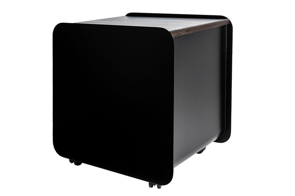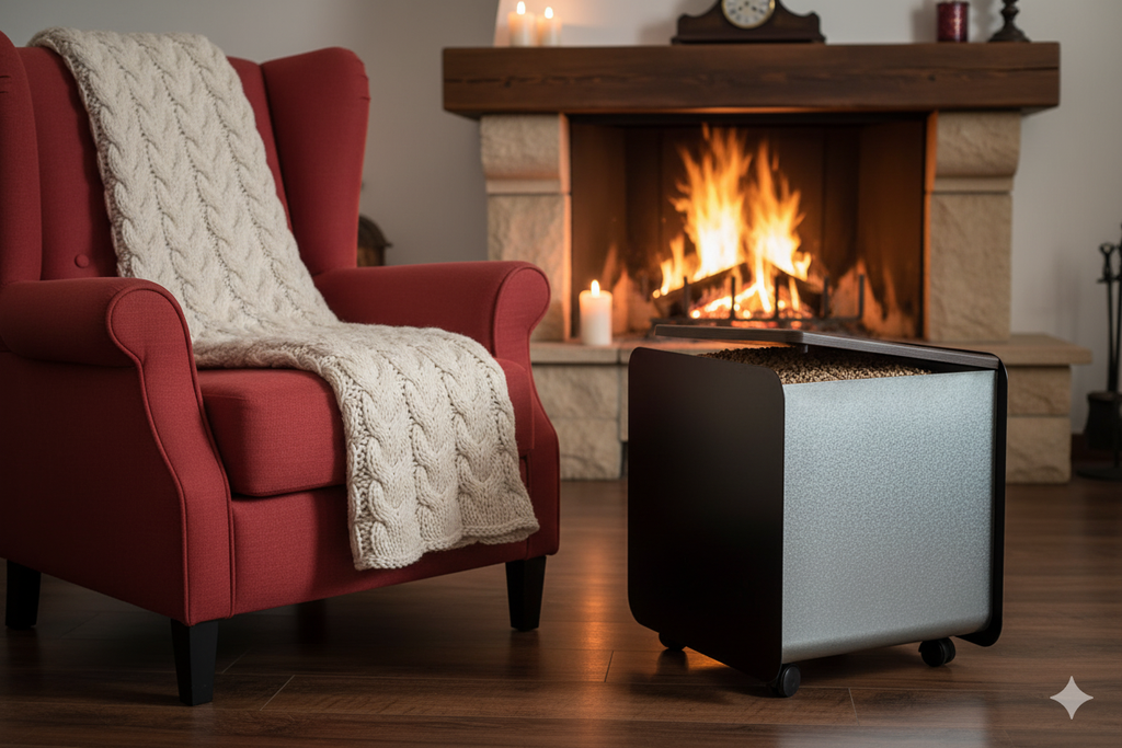 Porta pellet con coperchio base in ferro verniciato grigio martellato, coperchio in legno marrone scuro, dimensioni 40 x 49 x 50 cm. Made in Italy, montaggio richiesto.