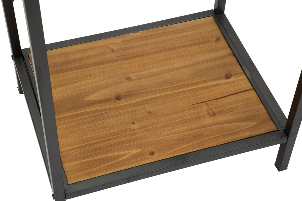 Telefonständer aus Metall und Holz mit Regal und Schublade. Möbel, die eine große visuelle Wirkung haben und die jede Umgebung originell und unterirdisch machen, ohne auf Praktikabilität zu verzichten.