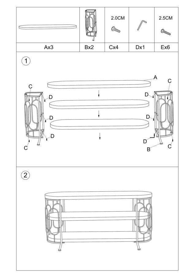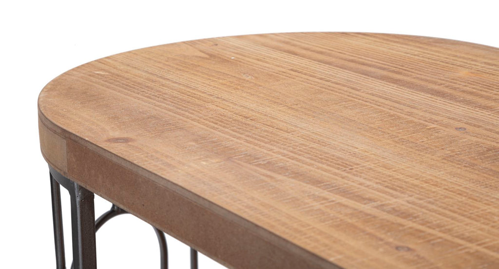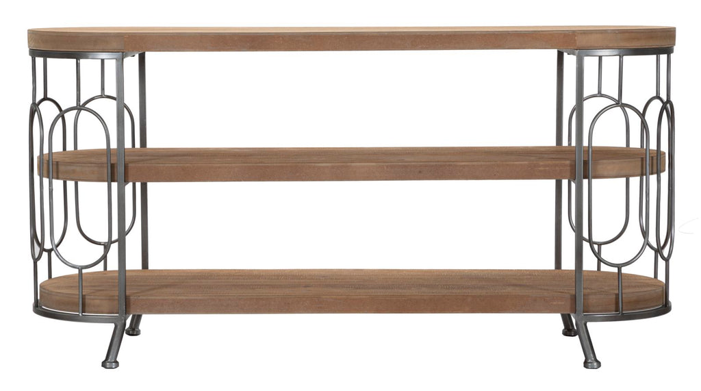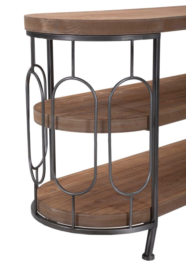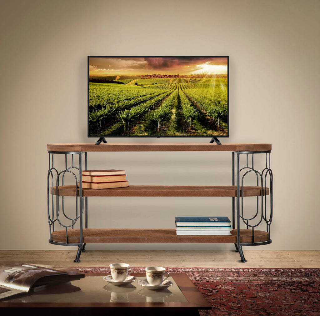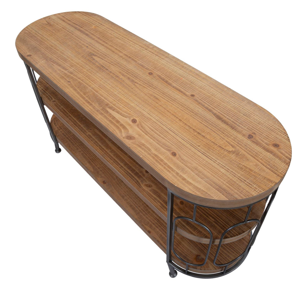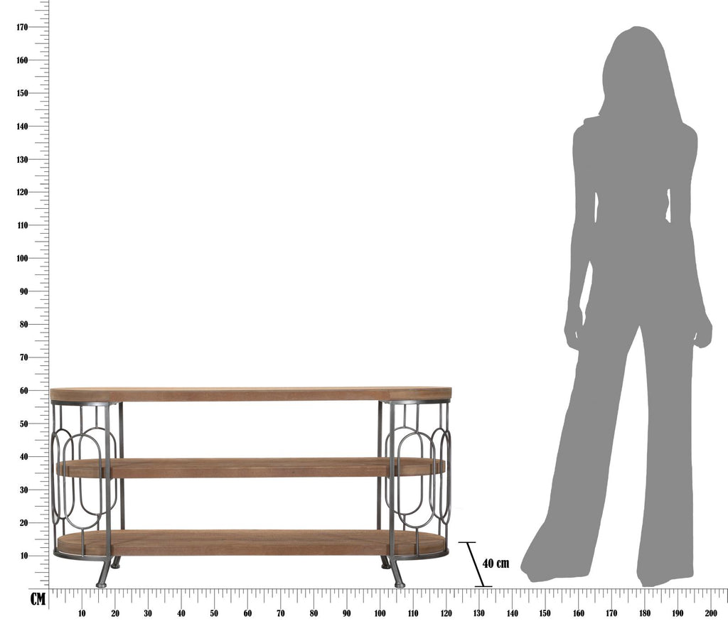 TV-Schrank aus Metall mit Platte und 2 Holzregalen mit abgerundeten Linien. Das weiche und elegante Design verleiht jeder industriellen Umgebung einen Hauch von Ausgewogenheit.