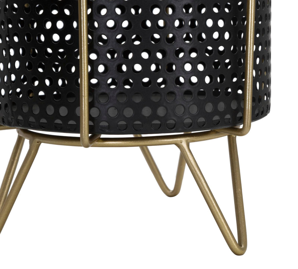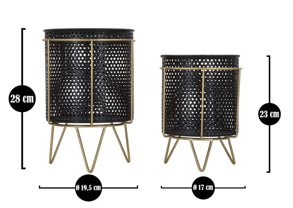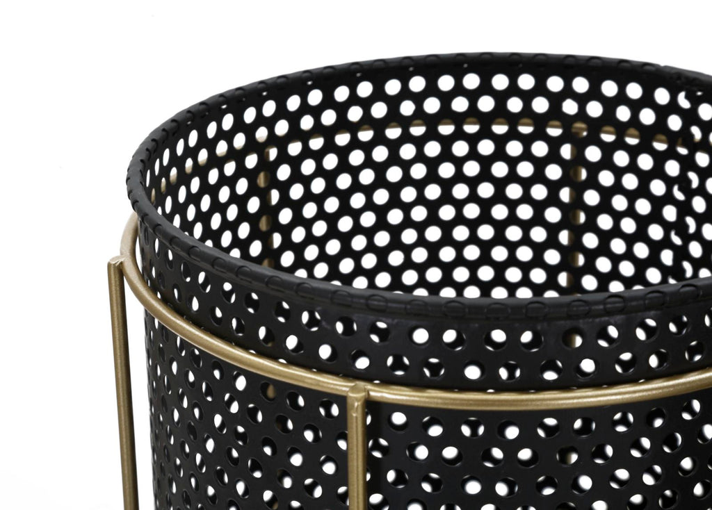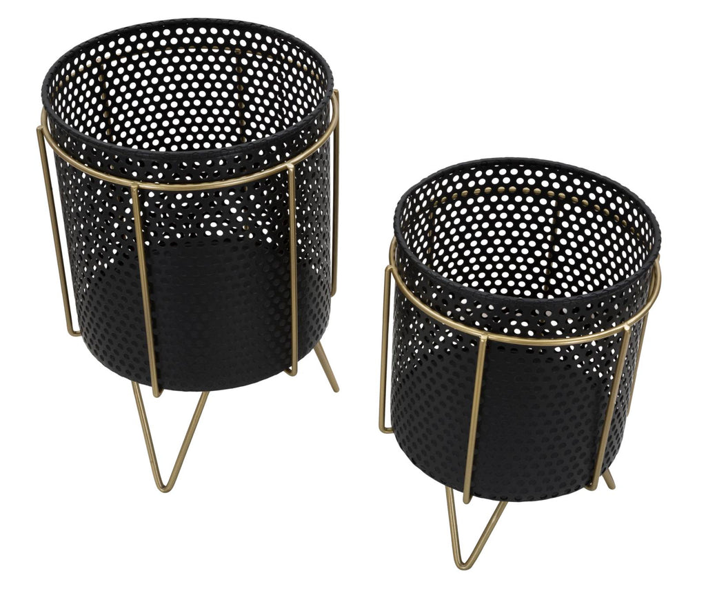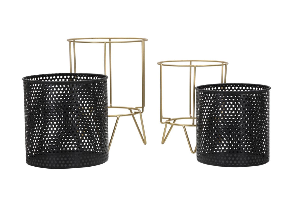 Paar Vasenhalter aus schwarzem Metall mit vergoldeten Metallsockeln. Die besondere Maschenarbeit und die Kombination von Schwarz und Gold schaffen einen perfekten und eleganten Kontrast.