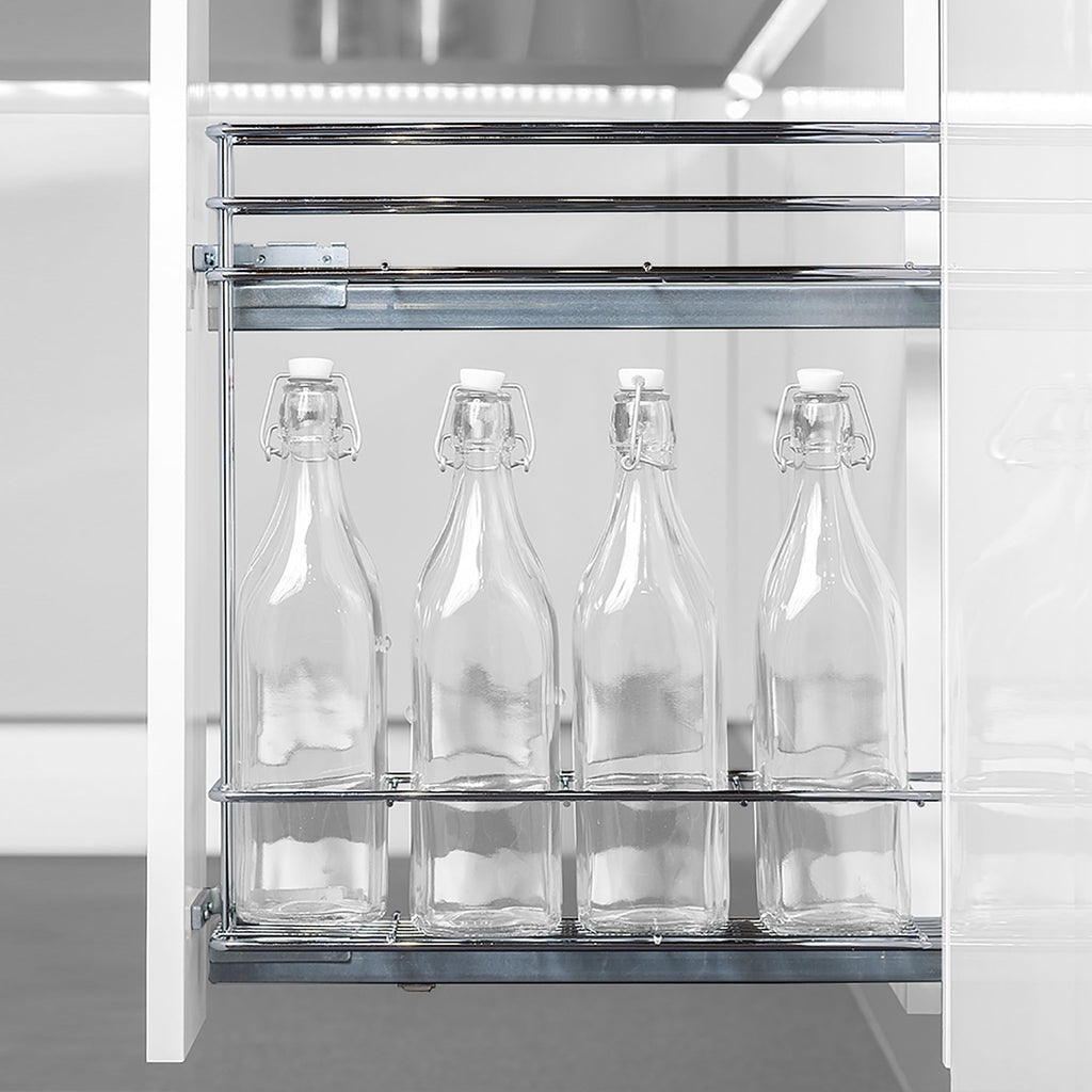 Ausziehbarer Flaschenhalter für niedrigere Module, ideal für kleine Räume in der Küche . Seine Struktur besteht aus verchromtem Stahl mit 2 Ebenen und hat Führungen mit Kugeln, die ein sanftes Herausziehen des Systems ermöglichen. Einfach zu installieren, kann sowohl rechts als auch links befestigt werden. Das Supra-Sortiment zeichnet sich durch einen wettbewerbsfähigen Preis aus, wobei immer die beste Qualität beibehalten wird.