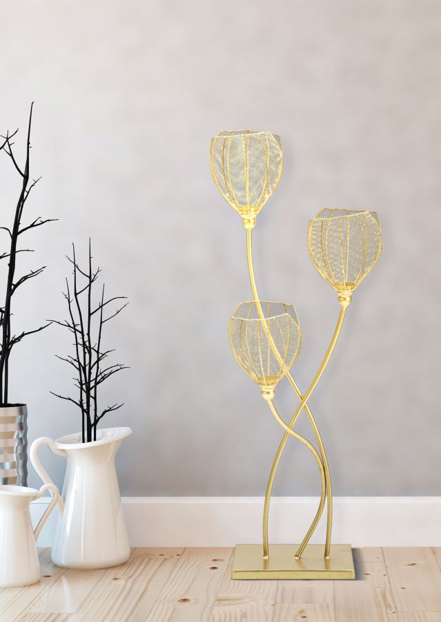 Eleganter 3-flammiger Kerzenhalter im Glam-Stil aus goldenem Metall mit floralem Design, ideal, um jeder Umgebung einen Hauch von Frische zu verleihen.