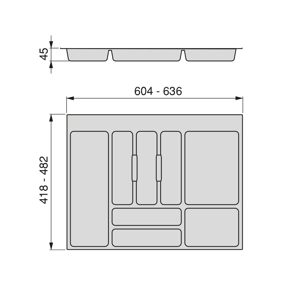 Besteckschublade für universelle Küchenschubladen mit geradlinigem Design und großem Fassungsvermögen für Besteck und andere Küchenutensilien, um den Platz optimal zu nutzen. Da sie zuschneidbar sind, können sie für die Verwendung mit standardmäßig eingebauten Modulschubladen mit einer Breite zwischen 400 mm und 1000 mm , einer Tiefe zwischen 450 mm und 500 mm und einer Plattendicke zwischen 16 mm und 19 mm je nach ausgewähltem Modul dimensioniert werden.