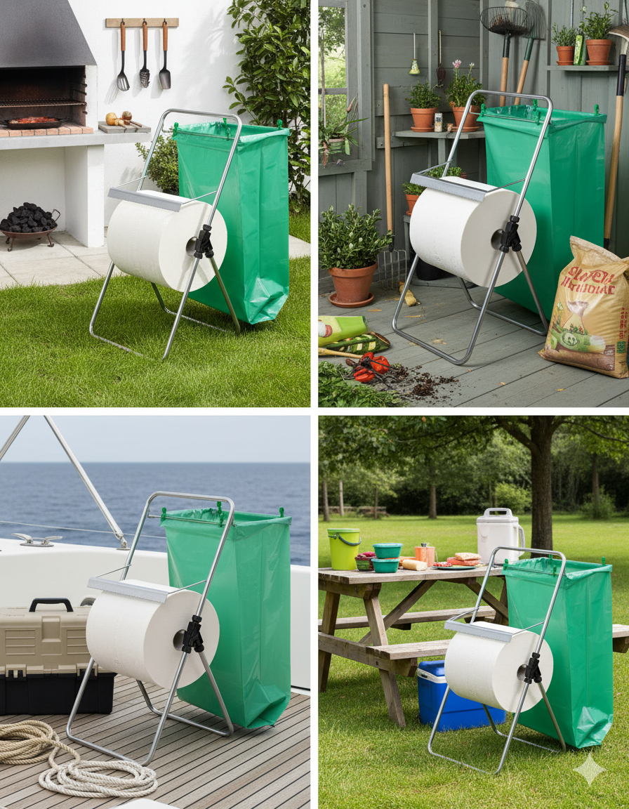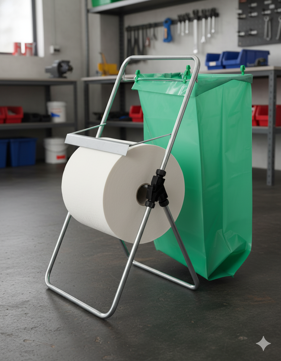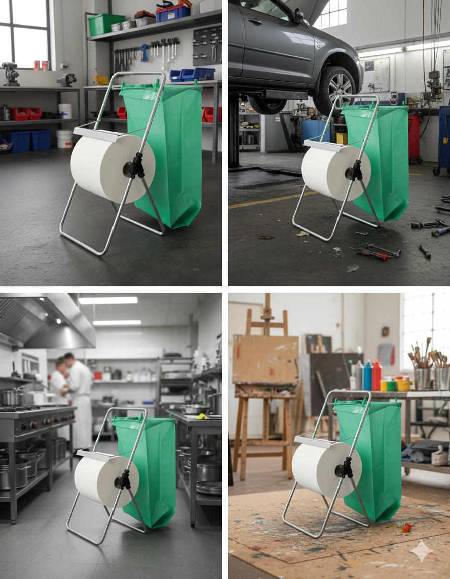 Staffelei-Papierrollenhalter aus verzinktem Stahl: kann eine Papierrolle (Rolle nicht im Lieferumfang enthalten) mit einer maximalen Breite von 30 cm aufnehmen (dies sind die Rollen, die üblicherweise in Italien für den privaten und industriellen Gebrauch verkauft werden). Ausgestattet mit Taschenhalterahmen und Taschenhalteclips 1 Tasche im Lieferumfang enthalten.