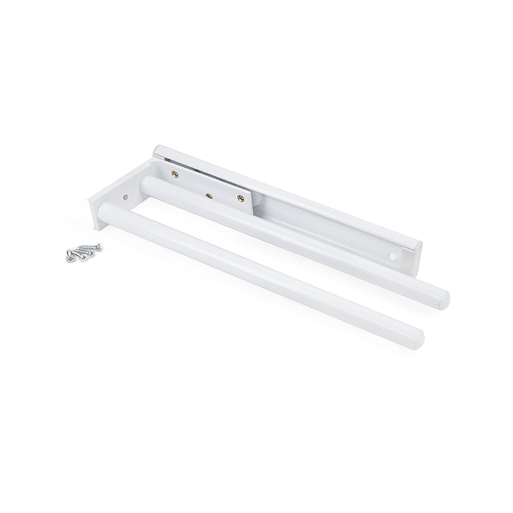 Praktischer ausziehbarer Handtuchhalter für Küche oder Bad aus Aluminium in matt oder weiß eloxiert . Es hat zwei Arme zum Aufhängen von Handtüchern oder Geschirrtüchern, kann je nach Verwendung um 90° gedreht werden, an der Seite des Möbels oder unter einem Regal (Befestigungsschrauben enthalten). Teleskopisch dank der Führung, die es hat, was es sehr zugänglich macht.