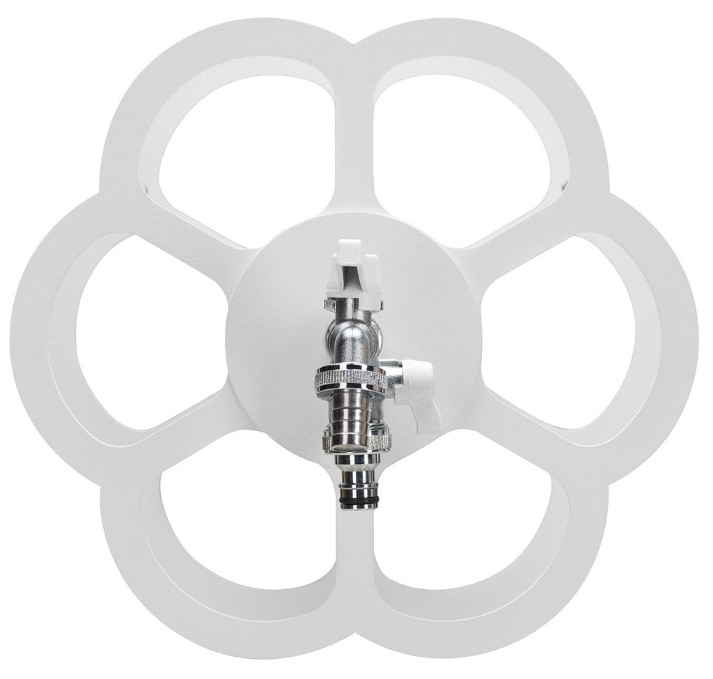 Pratico portatubo a muro che permette di trasformare un semplice rubinetto in un elemento funzionale e decorativodove riporre ordinatamente il tubo da innaffio, tenendolo sempre collegato al rubinetto secondario.