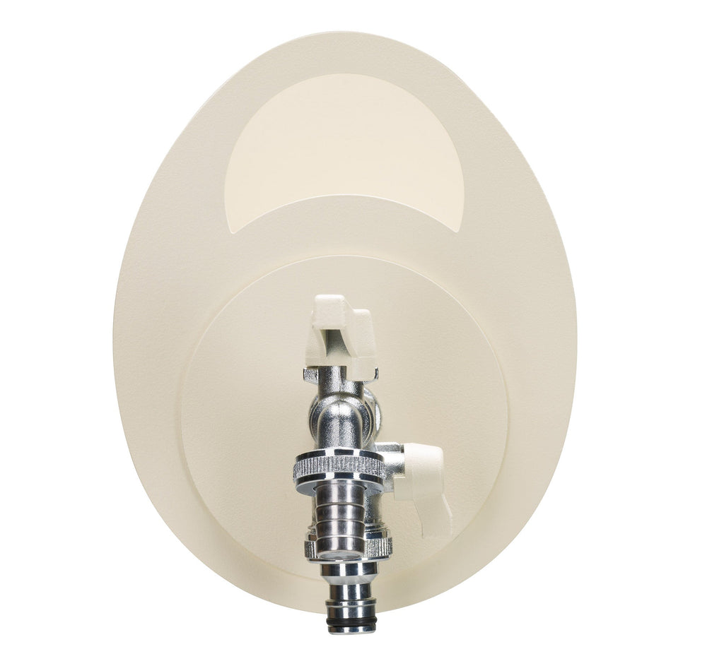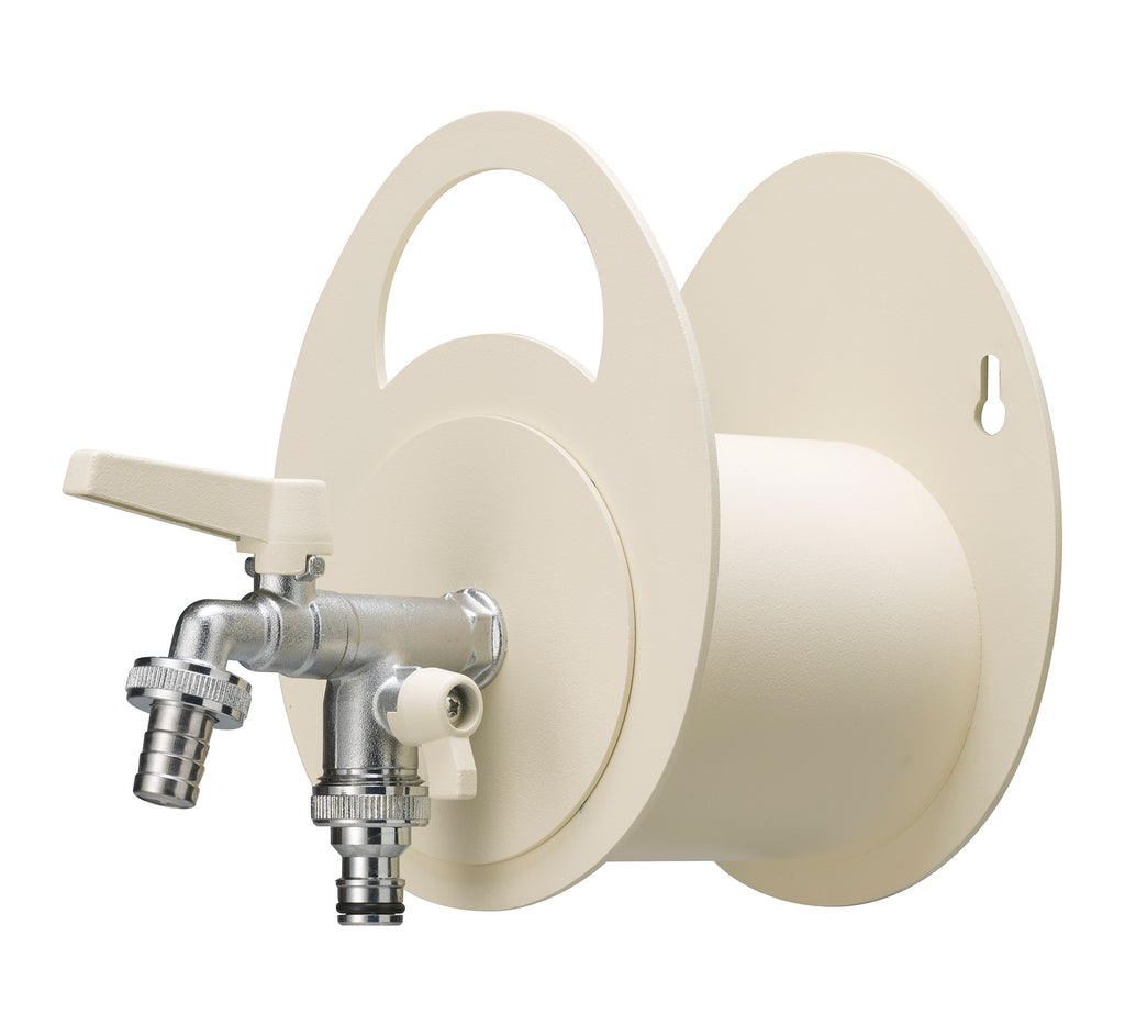Pratico portatubo a muro che permette di trasformare un semplice rubinetto in un elemento funzionale e decorativodove riporre ordinatamente il tubo da innaffio, tenendolo sempre collegato al rubinetto secondario.
