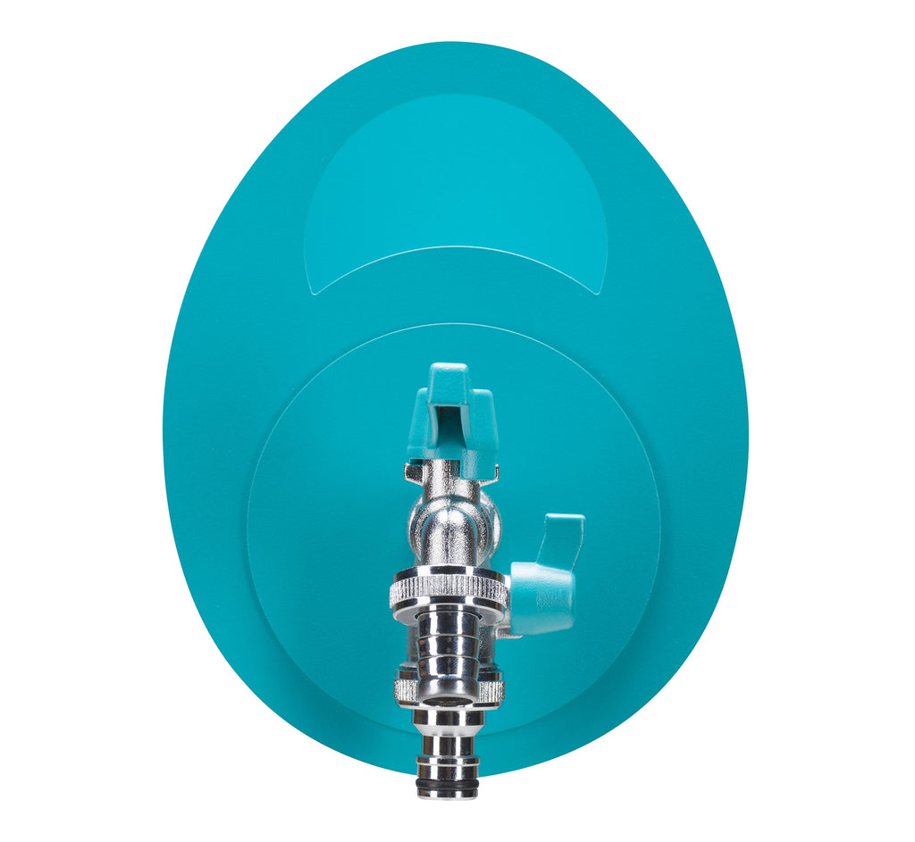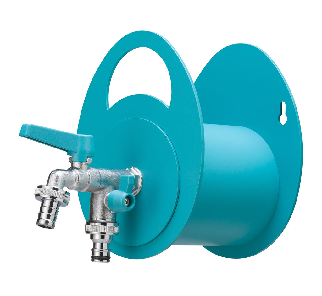 Pratico portatubo a muro che permette di trasformare un semplice rubinetto in un elemento funzionale e decorativodove riporre ordinatamente il tubo da innaffio, tenendolo sempre collegato al rubinetto secondario.