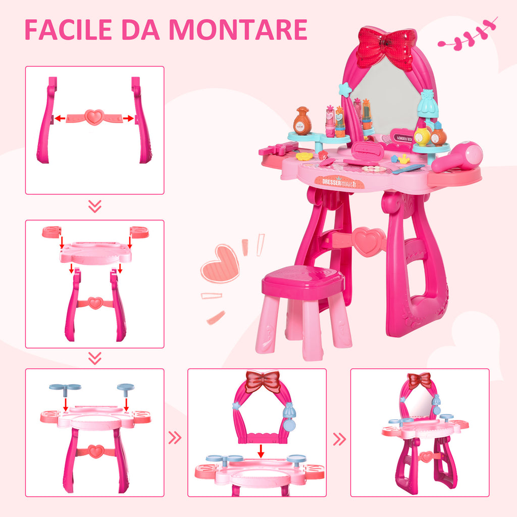 Möchten Sie Ihrer kleinen Prinzessin das richtige Geschenk machen? Dieses fantastische Komplettset aus Schminktisch mit Hocker und Zubehör wird sie zum Träumen bringen! Der Spiegel ist mit Lichtern und Geräuschen ausgestattet, die wie mit einem Hauch von Magie geändert werden können, indem Sie Ihre Hand vor dem Infrarotsensor bewegen. Der Schminktisch für Kinder ist mit vielen Accessoires wie Armbändern, Lippenstiften, Nagellack, Kämmen und Haartrocknern ausgestattet, um Spaß zu haben und davon zu träumen, groß zu sein!