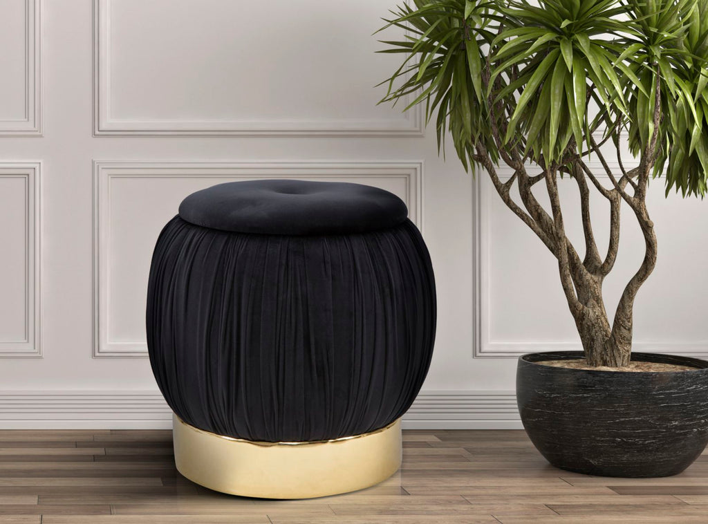 Paris Black Storage Puff Ø41x41 cm aus Schwammholz und schwarzem und goldenem Polyester