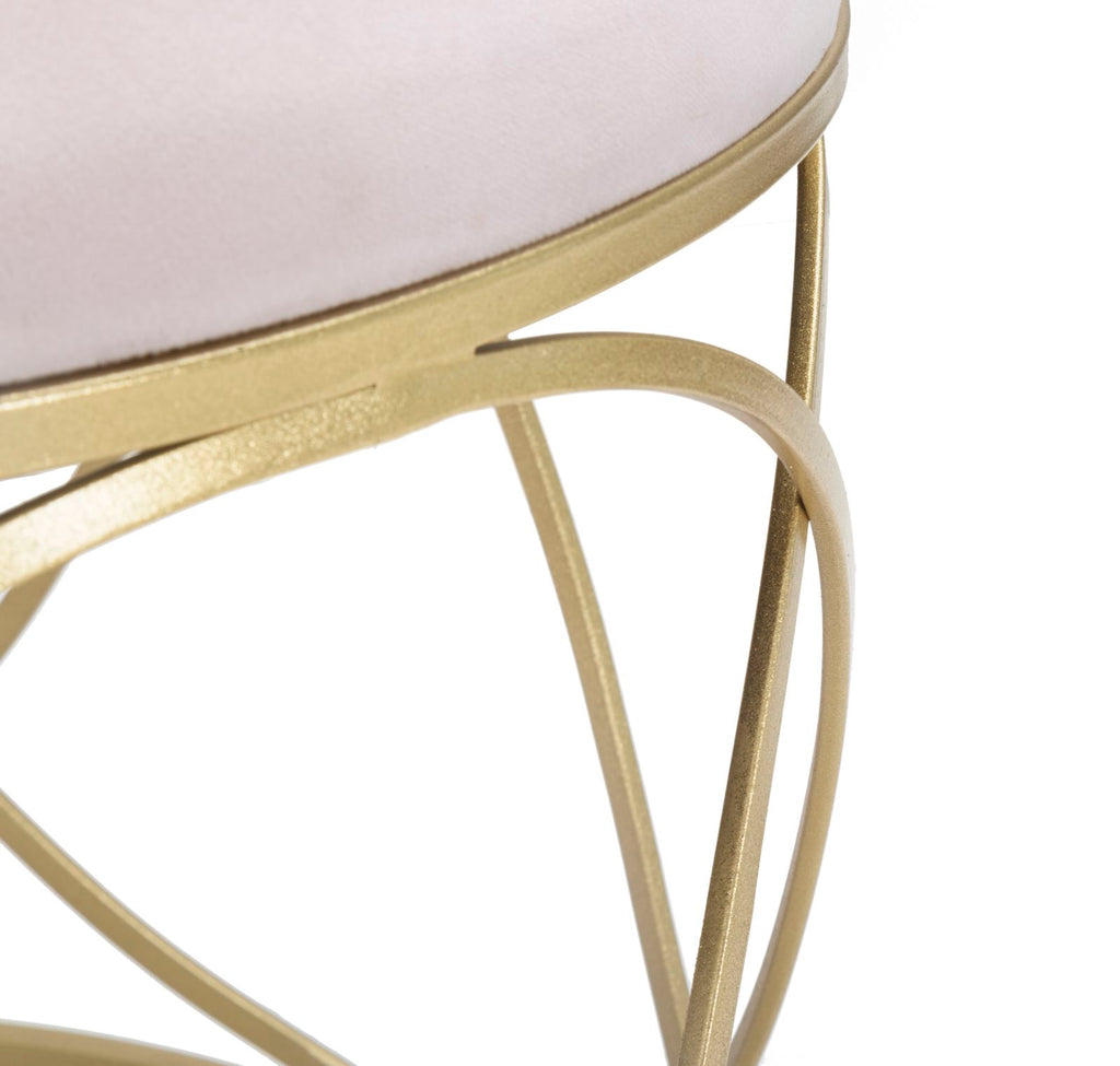 Eleganter runder Hocker aus rosa gepolstertem Samt mit goldener Metallstruktur. Die weiche und gewundene Dekoration verleiht jeder Umgebung einen Hauch von Klasse und Entspannung.