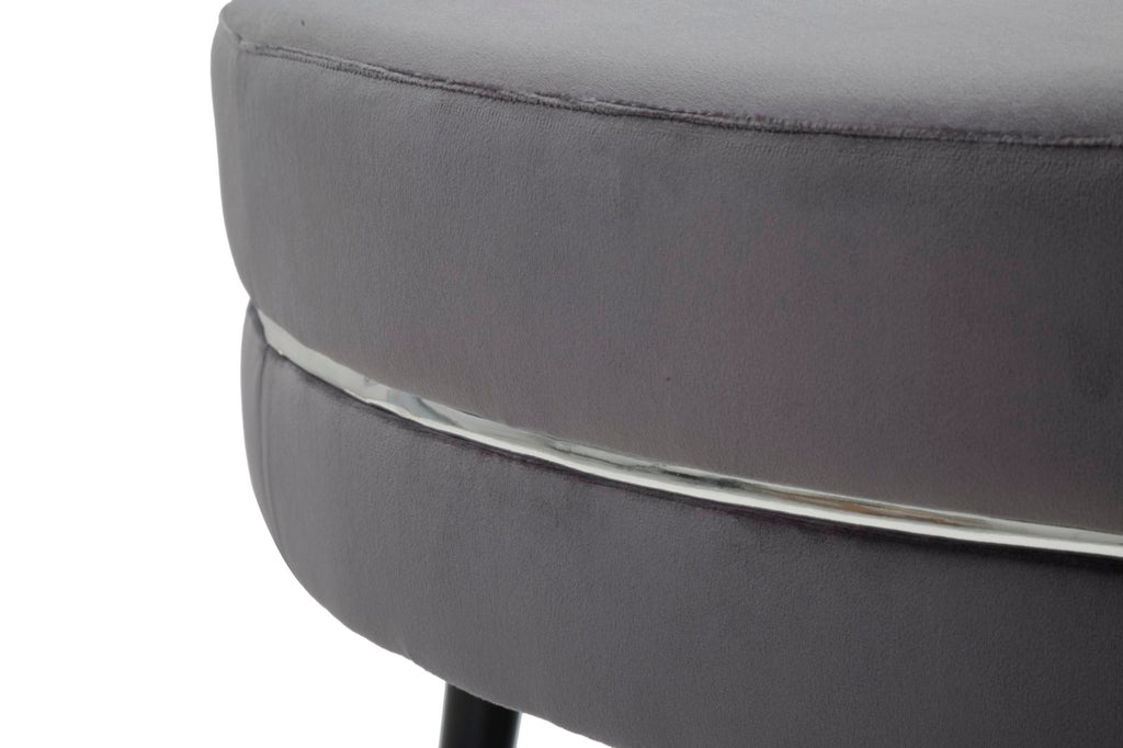Eleganter gepolsterter Pouf aus grauem Samt. Schlichte schwarze Holzbeine mit silbernem Finish und eine silberne Dekoration für den gesamten Umfang vervollständigen es und verleihen Ihrem Zuhause einen Hauch von Klasse und Schlichtheit.