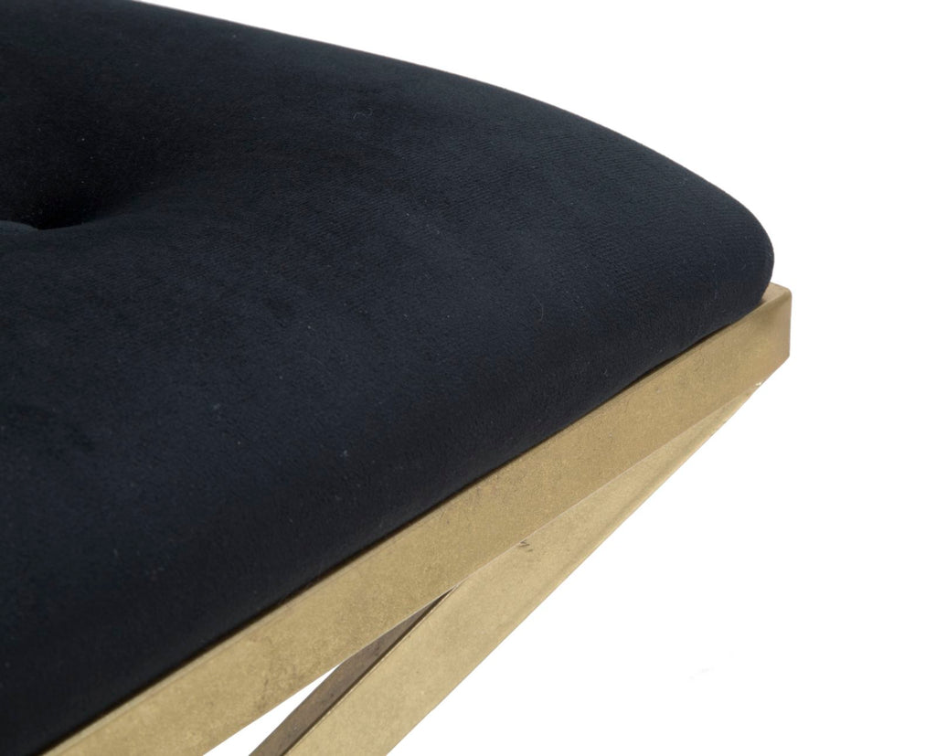Quadratischer Hocker aus vergoldetem Metall und Stoff mit geometrischen und hypnotischen Linien. Einrichtungselemente, die an die luxuriösen Zimmer des Hotel Plaza in New York erinnern. Stellen Sie die magische Atmosphäre des Großen Gatsby in Ihrem Interieur wieder her