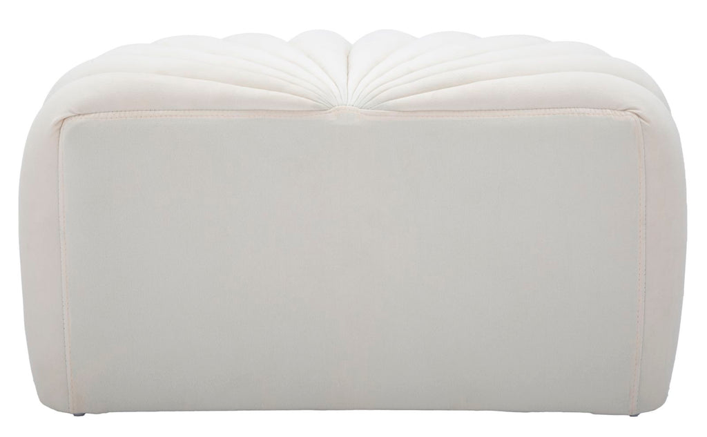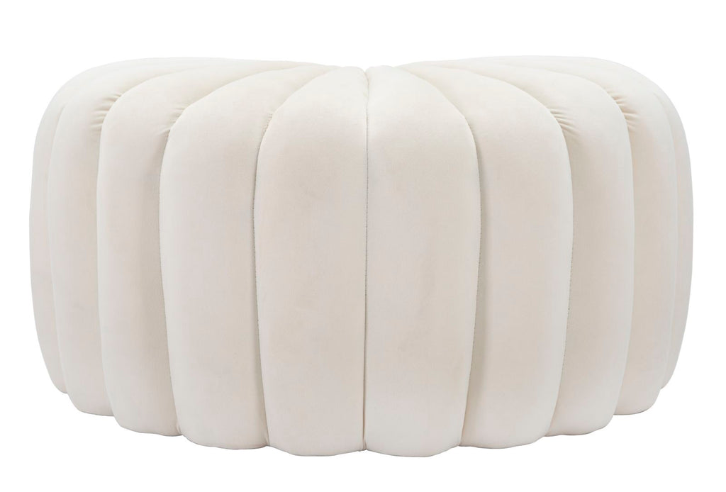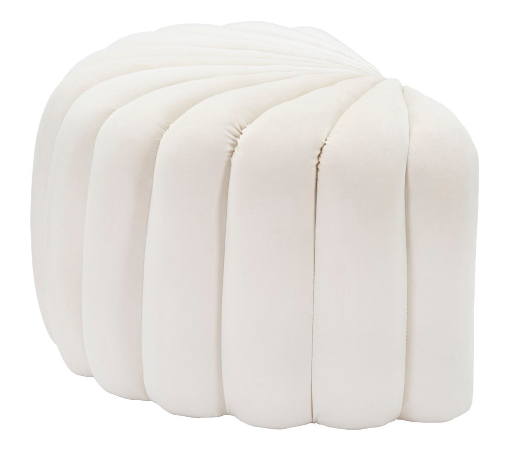 Eleganter und origineller Puff aus cremefarbenem, gepolstertem Stoff. Das Design erinnert an eine Muschel, um jeder Art von Möbeln einen exotischen Touch zu verleihen.